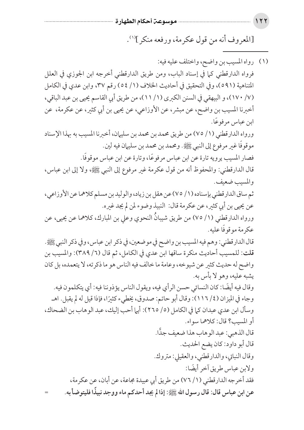 قال الدارقطني: وهم فيه المسيب بن واضح في موضعين، في ذكر ابن عباس، وفي ذكر النبي صلى الله عليه وسلم.
