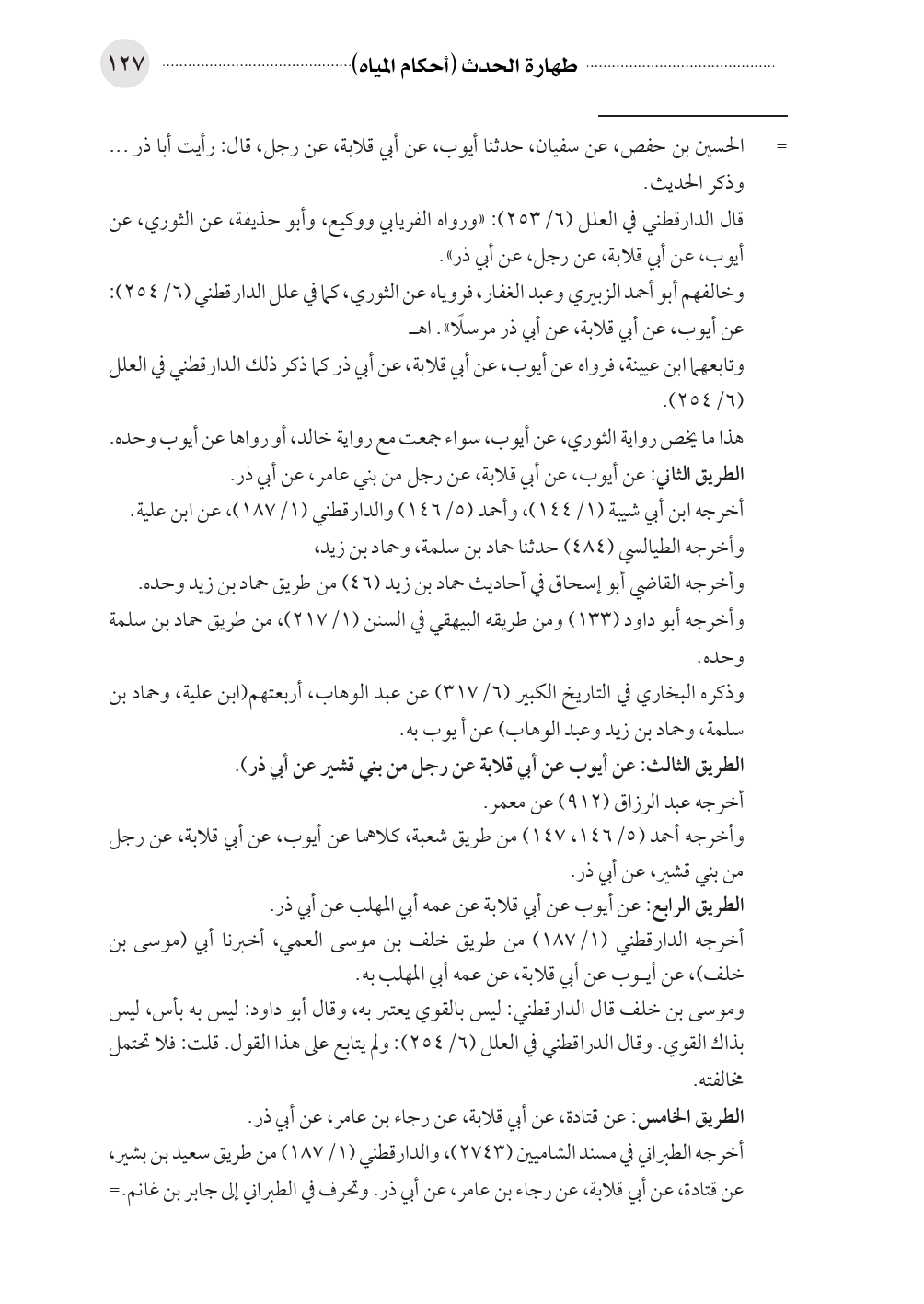 قال الدارقطني في العلل (٦/ ٢٥٣): «ورواه الفريابي ووكيع، وأبو حذيفة، عن الثوري، عن أيوب، عن أبي قلابة، عن رجل، عن أبي ذر».