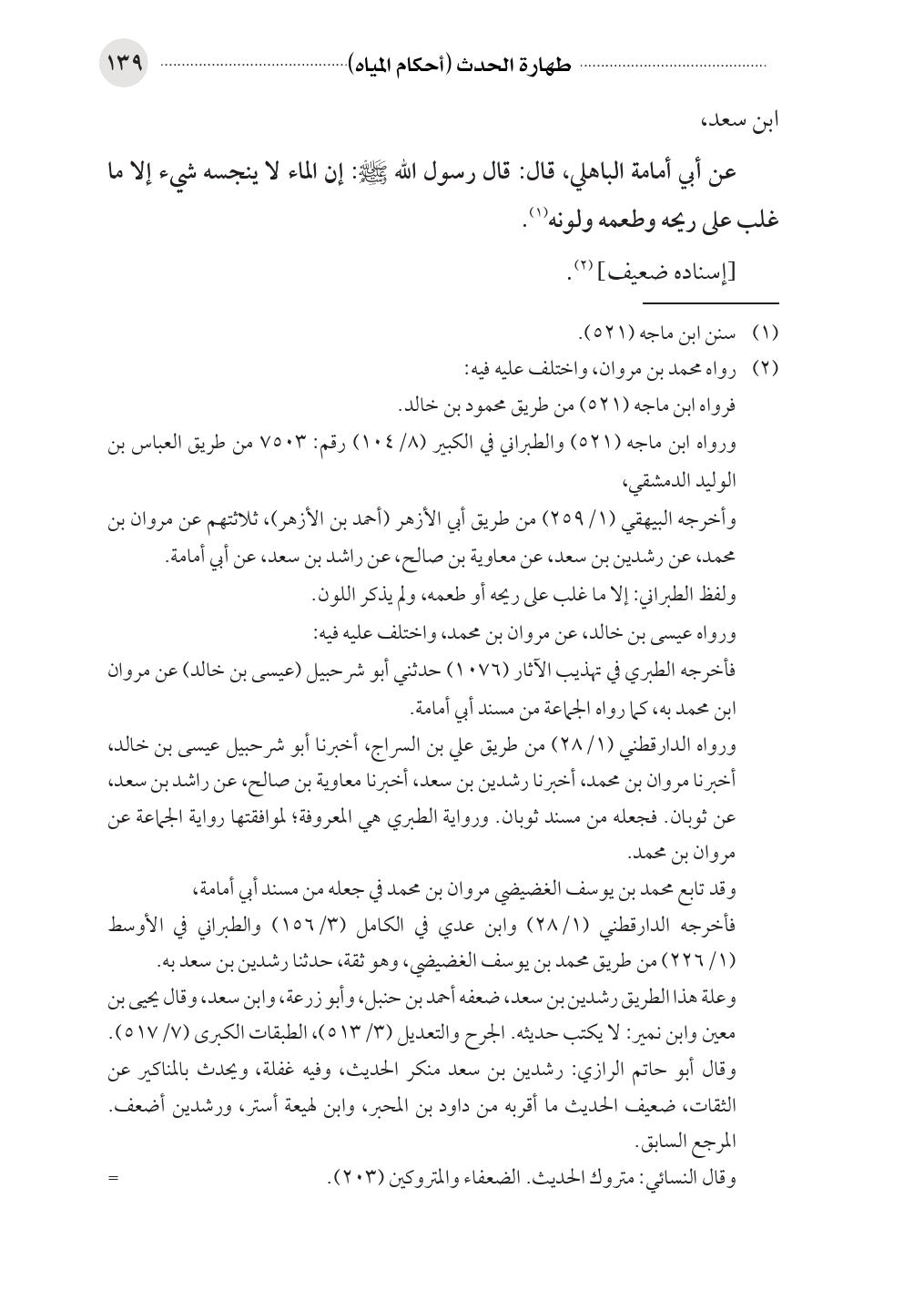 ابن سعد، عن أبي أمامة الباهلي، قال: قال رسول الله صلى الله عليه وسلم: إن الماء لا ينجسه شيء إلا ما غلب على ريحه وطعمه ولونه (¬١).