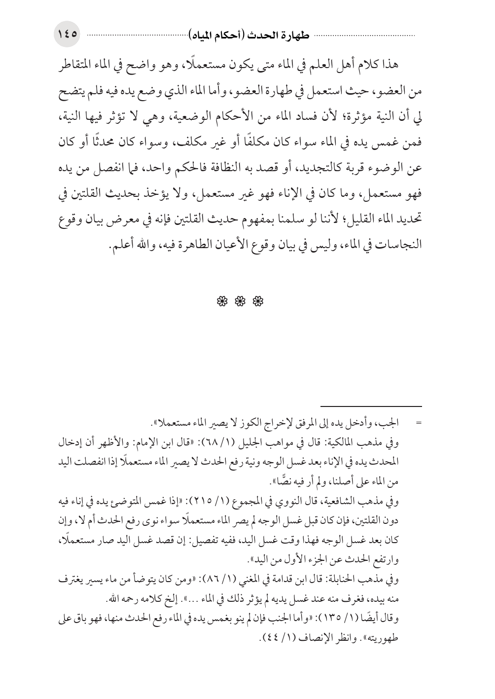 هذا كلام أهل العلم في الماء متى يكون مستعملًا، وهو واضح في الماء المتقاطر من العضو، حيث استعمل في طهارة العضو، وأما الماء الذي وضع يده فيه فلم يتضح لي أن النية مؤثرة؛ لأن فساد الماء من الأحكام الوضعية، وهي لا تؤثر فيها النية، فمن غمس يده في الماء سواء كان مكلفًا أو غير مكلف، وسواء كان محدثًا أو كان عن الوضوء قربة كالتجديد، أو قصد به النظافة فالحكم واحد، فما انفصل من يده فهو مستعمل، وما كان في الإناء فهو غير مستعمل، ولا يؤخذ بحديث القلتين في تحديد الماء القليل؛ لأننا لو سلمنا بمفهوم حديث القلتين فإنه في معرض بيان وقوع النجاسات في الماء، وليس في بيان وقوع الأعيان الطاهرة فيه، والله أعلم.