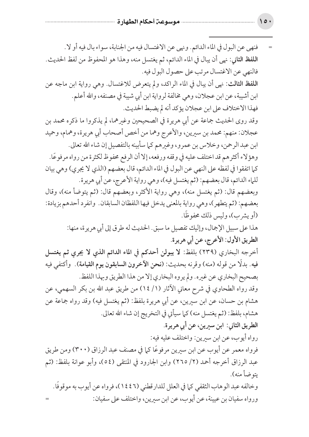 كما اتفقوا في لفظه على النهي عن البول في الماء الدائم، قال بعضهم (الذي لا يجري) وهي بيان للماء الدائم، قال بعضهم: (ثم يغتسل فيه)، وهي رواية الأعرج، عن أبي هريرة.