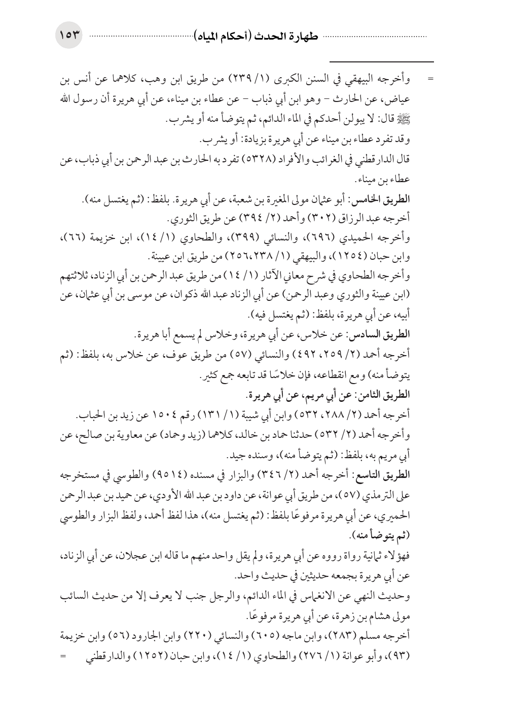 الطريق التاسع: أخرجه أحمد (٢/ ٣٤٦) والبزار في مسنده (٩٥١٤) والطوسي في مستخرجه على الترمذي (٥٧)، من طريق أبي عوانة، عن داود بن عبد الله الأودي، عن حميد بن عبد الرحمن الحميري، عن أبي هريرة مرفوعًا بلفظ: (ثم يغتسل منه)، هذا لفظ أحمد، ولفظ البزار والطوسي (ثم يتوضأ منه).