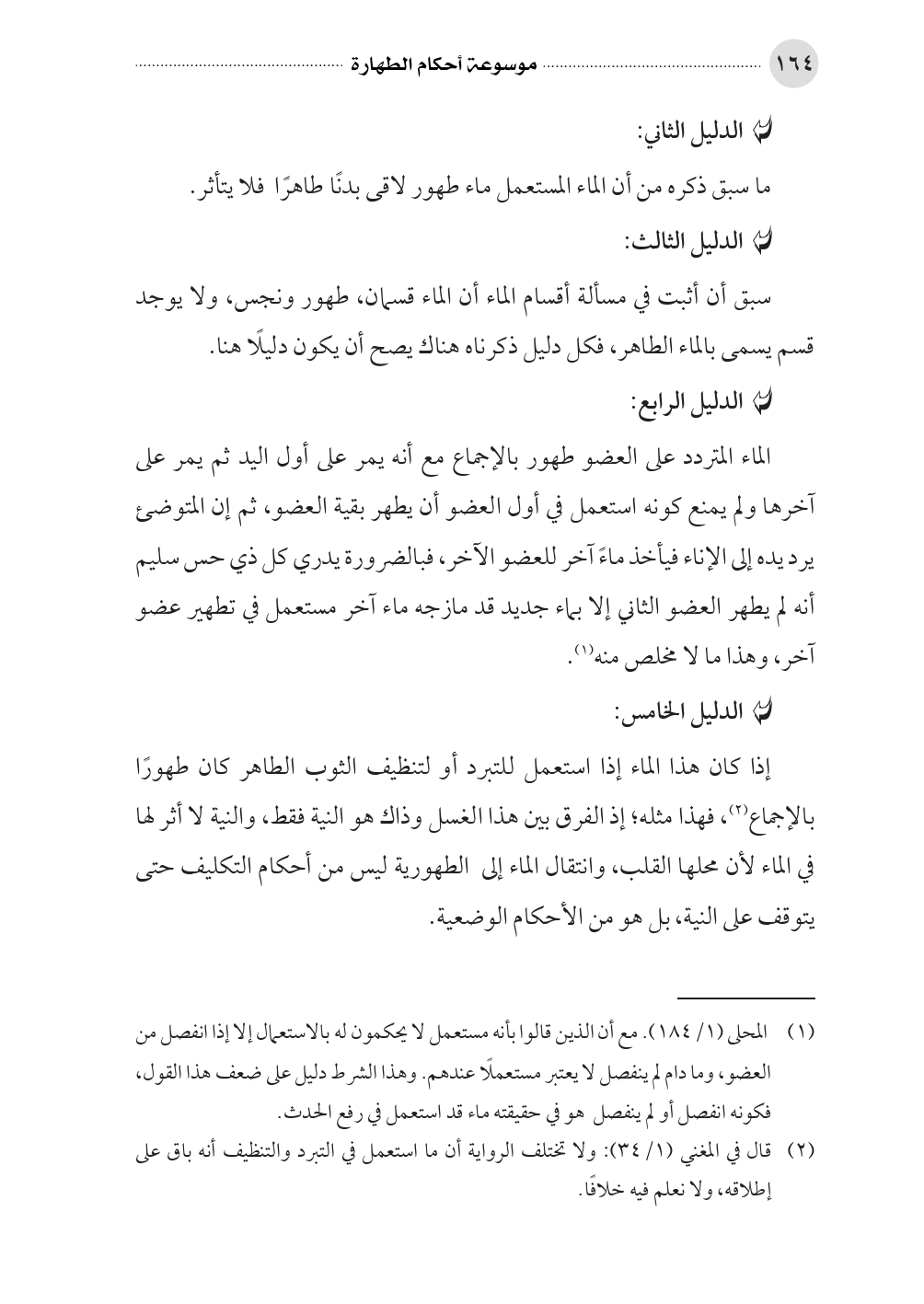 (¬١) المحلى (١/ ١٨٤). مع أن الذين قالوا بأنه مستعمل لا يحكمون له بالاستعمال إلا إذا انفصل من العضو، وما دام لم ينفصل لا يعتبر مستعملًا عندهم. وهذا الشرط دليل على ضعف هذا القول، فكونه انفصل أو لم ينفصل هو في حقيقته ماء قد استعمل في رفع الحدث.
