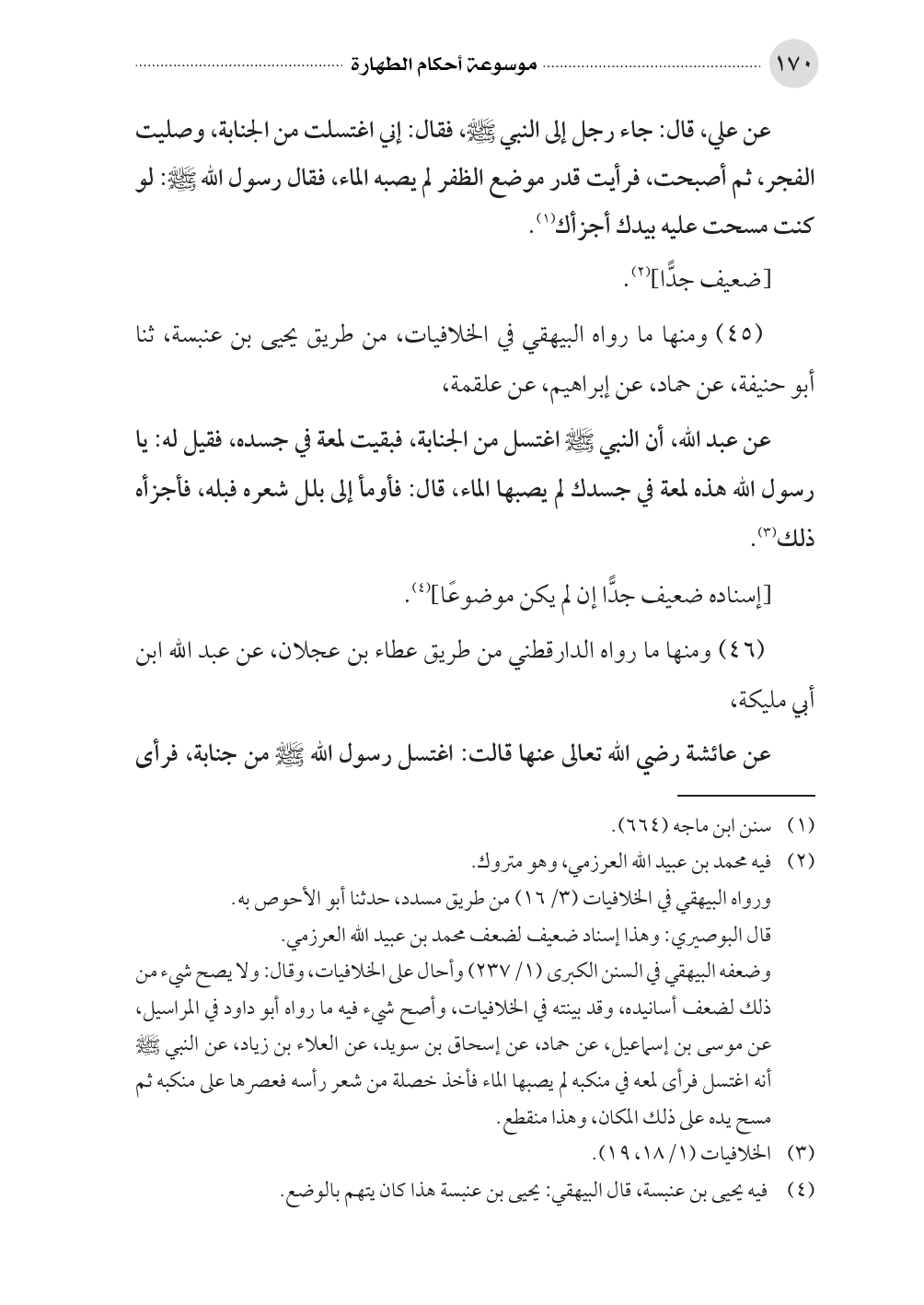 (٤٥) ومنها ما رواه البيهقي في الخلافيات، من طريق يحيى بن عنبسة، ثنا أبو حنيفة، عن حماد، عن إبراهيم، عن علقمة، عن عبد الله، أن النبي صلى الله عليه وسلم اغتسل من الجنابة، فبقيت لمعة في جسده، فقيل له: يا رسول الله هذه لمعة في جسدك لم يصبها الماء، قال: فأومأ إلى بلل شعره فبله، فأجزأه ذلك (¬٣).