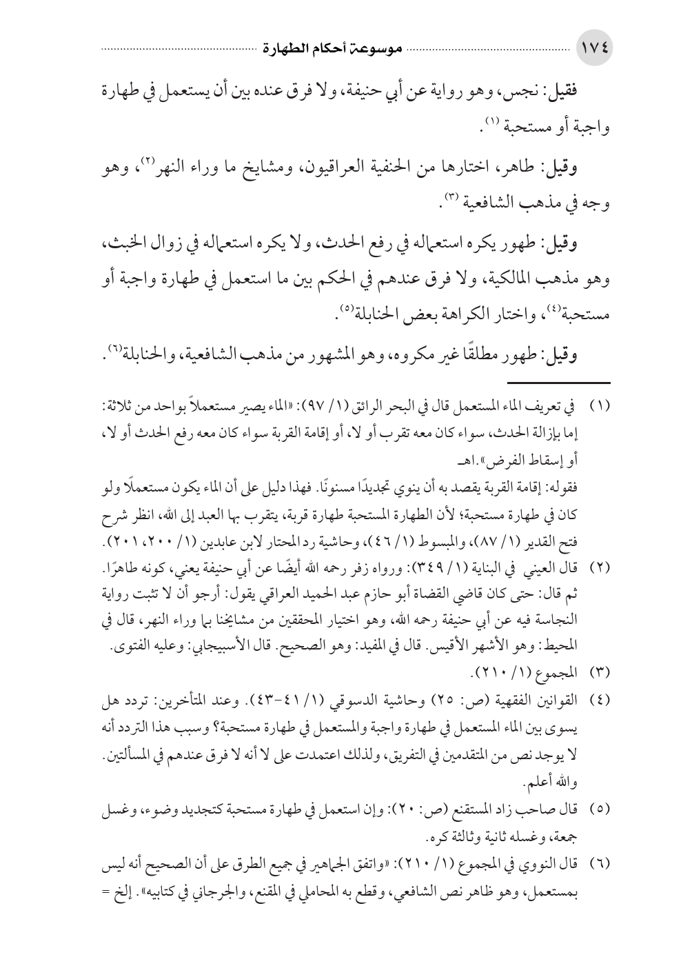 (¬٤) القوانين الفقهية (ص: ٢٥) وحاشية الدسوقي (١/ ٤١ - ٤٣). وعند المتأخرين: تردد هل يسوى بين الماء المستعمل في طهارة واجبة والمستعمل في طهارة مستحبة؟ وسبب هذا التردد أنه لا يوجد نص من المتقدمين في التفريق، ولذلك اعتمدت على لا أنه لا فرق عندهم في المسألتين. والله أعلم.