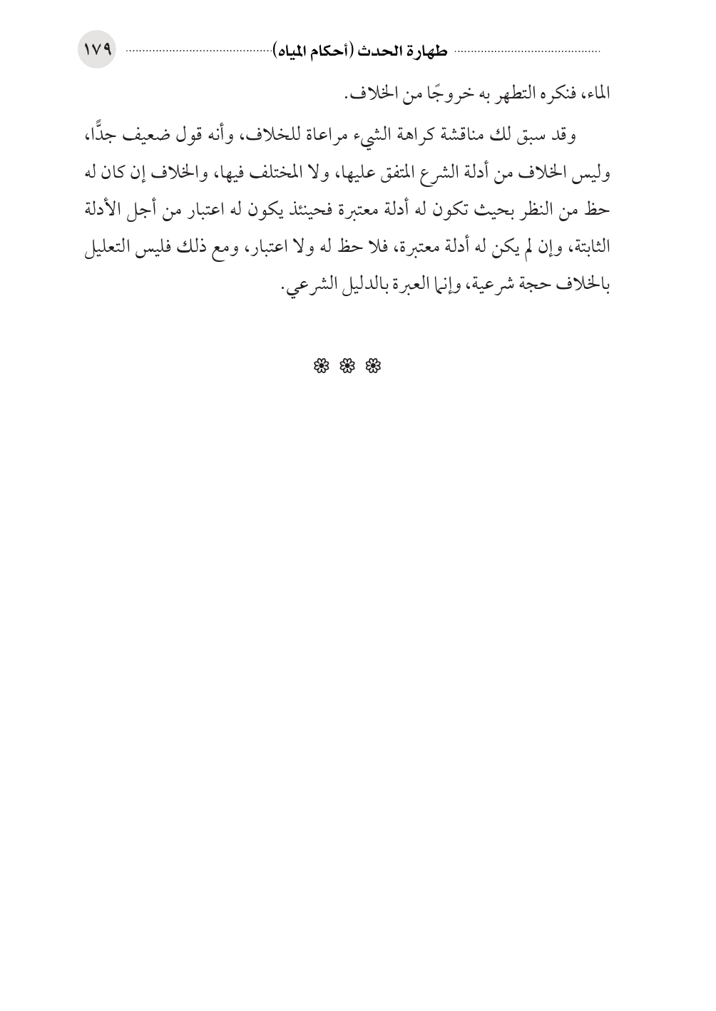 وقد سبق لك مناقشة كراهة الشيء مراعاة للخلاف، وأنه قول ضعيف جدًّا، وليس الخلاف من أدلة الشرع المتفق عليها، ولا المختلف فيها، والخلاف إن كان له حظ من النظر بحيث تكون له أدلة معتبرة فحينئذ يكون له اعتبار من أجل الأدلة الثابتة، وإن لم يكن له أدلة معتبرة، فلا حظ له ولا اعتبار، ومع ذلك فليس التعليل بالخلاف حجة شرعية، وإنما العبرة بالدليل الشرعي.