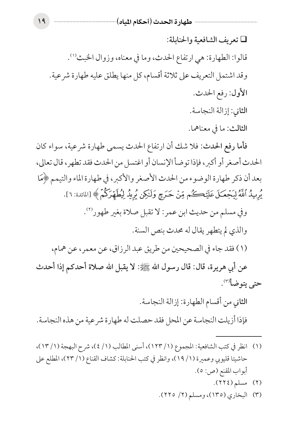 (¬١) انظر في كتب الشافعية: المجموع (١/ ١٢٣)، أسنى المطالب (١/ ٤)، شرح البهجة (١/ ١٣)، حاشيتا قليوبي وعميرة (١/ ١٩)، وانظر في كتب الحنابلة: كشاف القناع (١/ ٢٣)، المطلع على أبواب المقنع (ص: ٥).
