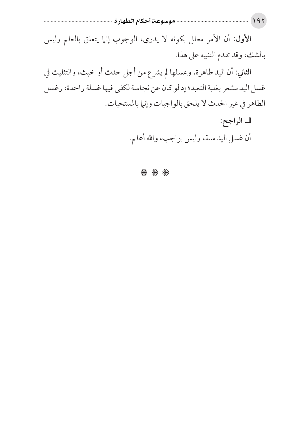 الثاني: أن اليد طاهرة، وغسلها لم يشرع من أجل حدث أو خبث، والتثليث في غسل اليد مشعر بغلبة التعبد؛ إذ لو كان عن نجاسة لكفى فيها غسلة واحدة، وغسل الطاهر في غير الحدث لا يلحق بالواجبات وإنما بالمستحبات.