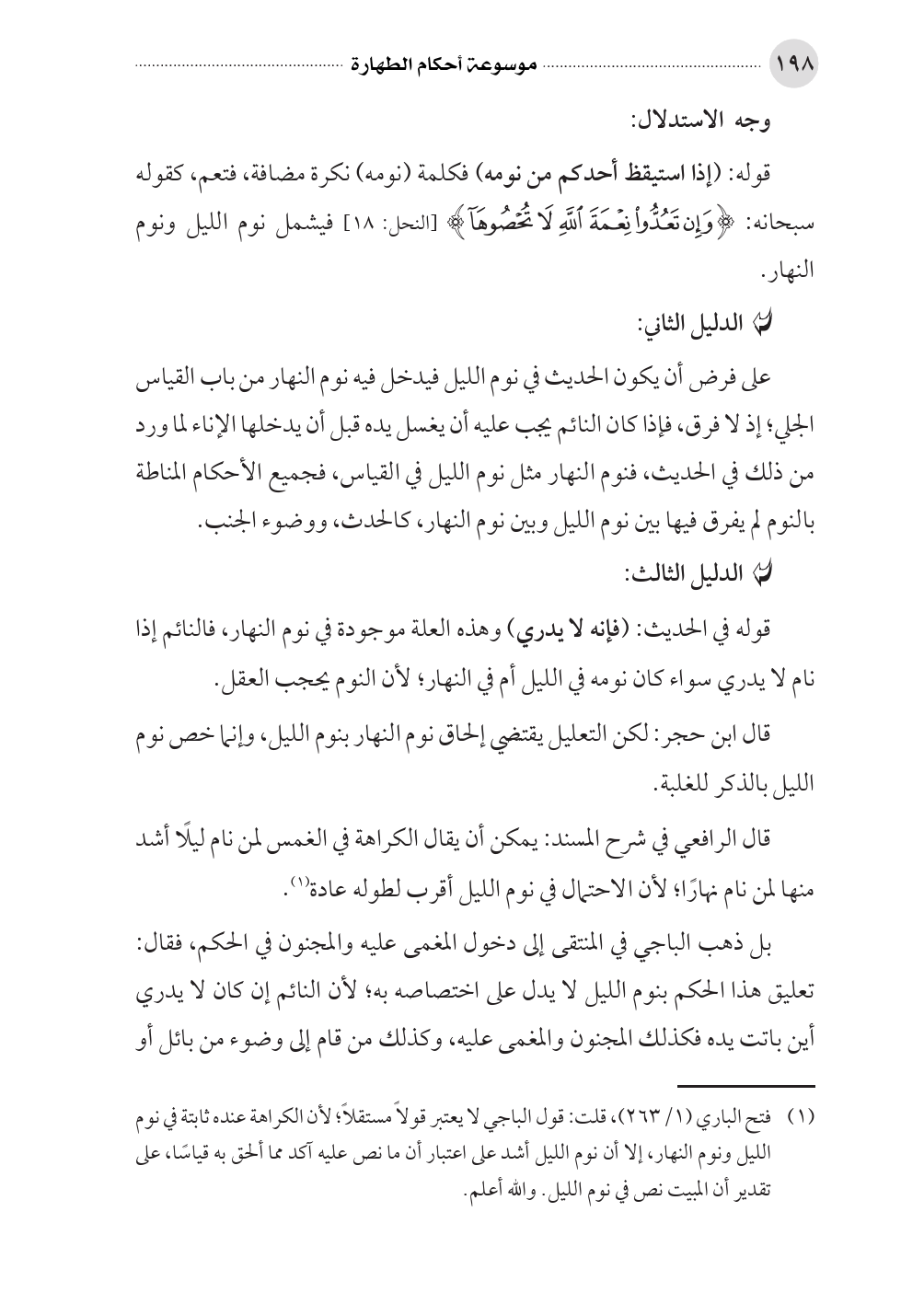 (¬١) فتح الباري (١/ ٢٦٣)، قلت: قول الباجي لا يعتبر قولًا مستقلًا؛ لأن الكراهة عنده ثابتة في نوم الليل ونوم النهار، إلا أن نوم الليل أشد على اعتبار أن ما نص عليه آكد مما ألحق به قياسًا، على تقدير أن المبيت نص في نوم الليل. والله أعلم.