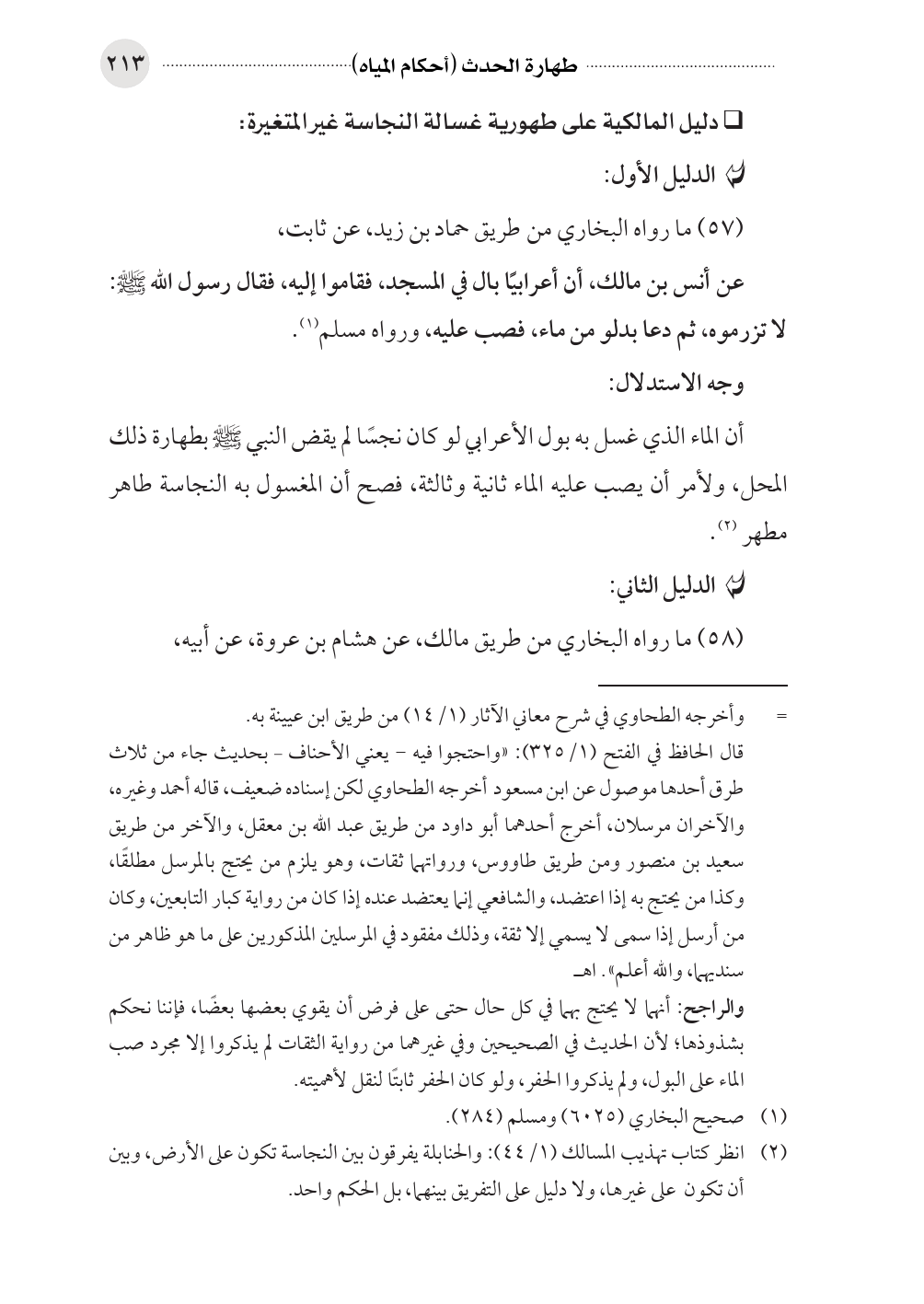 (٥٧) ما رواه البخاري من طريق حماد بن زيد، عن ثابت، عن أنس بن مالك، أن أعرابيًّا بال في المسجد، فقاموا إليه، فقال رسول الله صلى الله عليه وسلم: لا تزرموه، ثم دعا بدلو من ماء، فصب عليه، ورواه مسلم (¬١).