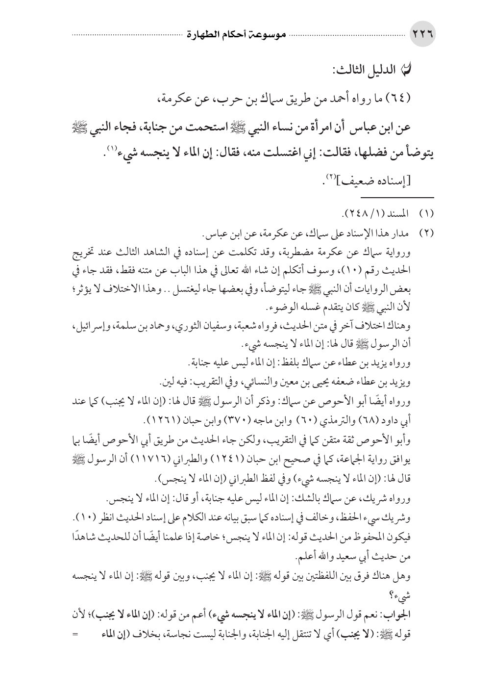 ورواية سماك عن عكرمة مضطربة، وقد تكلمت عن إسناده في الشاهد الثالث عند تخريج الحديث رقم (١٠)، وسوف أتكلم إن شاء الله تعالى في هذا الباب عن متنه فقط، فقد جاء في بعض الروايات أن النبي صلى الله عليه وسلم جاء ليتوضأ، وفي بعضها جاء ليغتسل .. وهذا الاختلاف لا يؤثر؛ لأن النبي صلى الله عليه وسلم كان يتقدم غسله الوضوء.