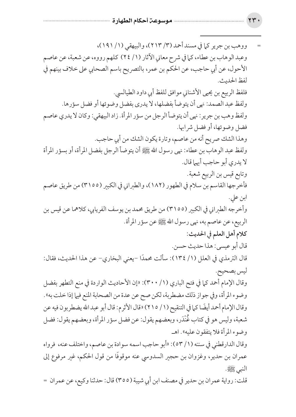 ولفظ عبد الوهاب بن عطاء: نهى رسول الله صلى الله عليه وسلم أن يتوضأ الرجل بفضل المرأة، أو بسؤر المرأة لا يدري أبو حاجب أيهما قال.