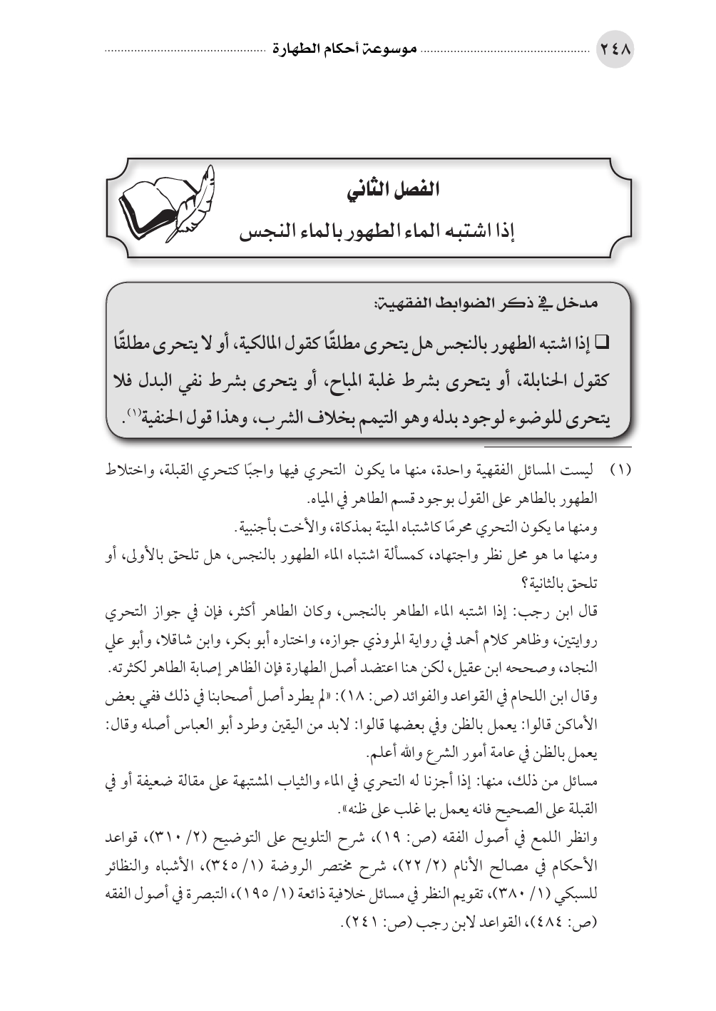 ومنها ما هو محل نظر واجتهاد، كمسألة اشتباه الماء الطهور بالنجس، هل تلحق بالأولى، أو تلحق بالثانية؟