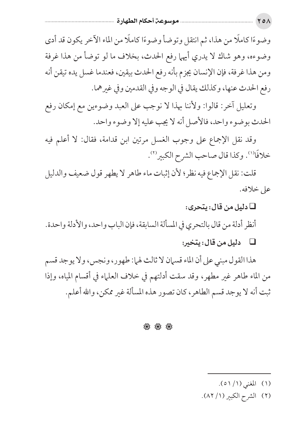 وضوءًا كاملًا من هذا، ثم انتقل وتوضأ وضوءًا كاملًا من الماء الآخر يكون قد أدى وضوءه، وهو شاك لا يدري أيهما رفع الحدث، بخلاف ما لو توضأ من هذا غرفة ومن هذا غرفة، فإن الإنسان يجزم بأنه رفع الحدث بيقين، فعندما غسل يده تيقن أنه رفع الحدث عنها، وكذلك يقال في الوجه وفي القدمين وفي غيرهما.