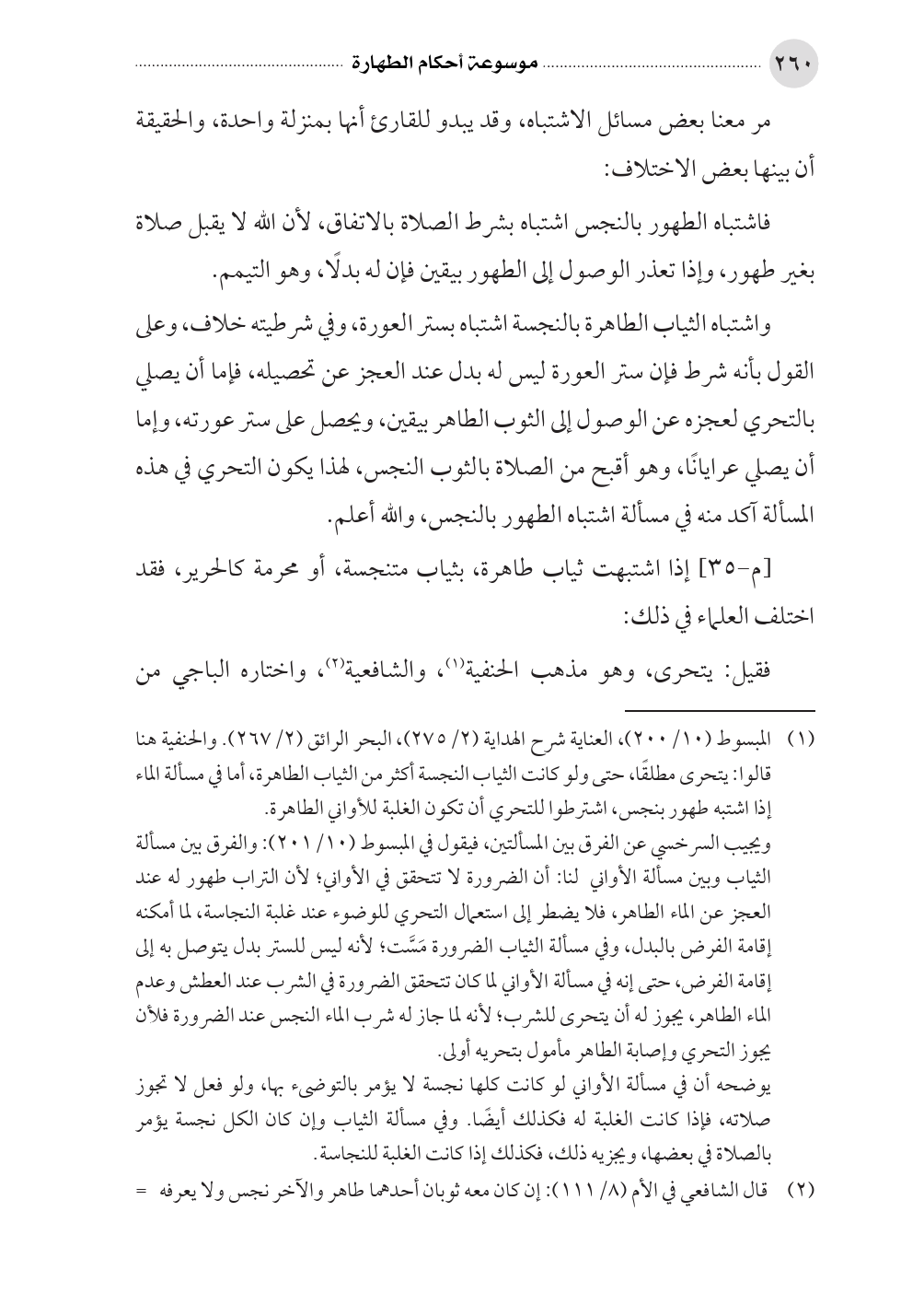(¬١) المبسوط (١٠/ ٢٠٠)، العناية شرح الهداية (٢/ ٢٧٥)، البحر الرائق (٢/ ٢٦٧). والحنفية هنا قالوا: يتحرى مطلقًا، حتى ولو كانت الثياب النجسة أكثر من الثياب الطاهرة، أما في مسألة الماء إذا اشتبه طهور بنجس، اشترطوا للتحري أن تكون الغلبة للأواني الطاهرة.