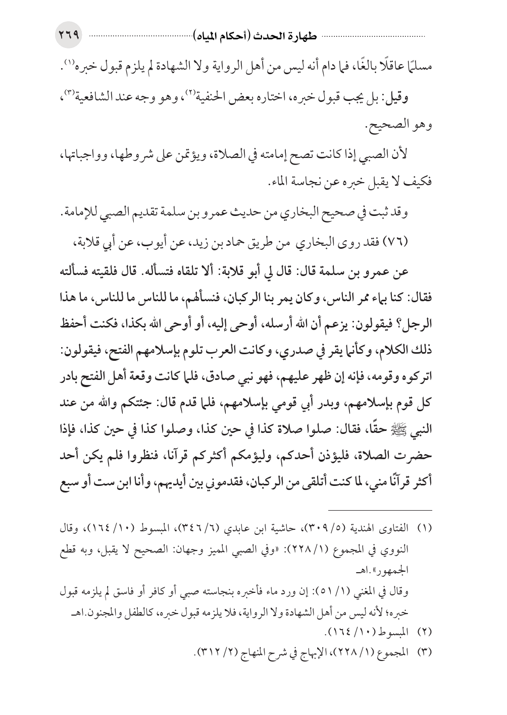 (¬١) الفتاوى الهندية (٥/ ٣٠٩)، حاشية ابن عابدي (٦/ ٣٤٦)، المبسوط (١٠/ ١٦٤)، وقال النووي في المجموع (١/ ٢٢٨): «وفي الصبي المميز وجهان: الصحيح لا يقبل، وبه قطع الجمهور».اهـ