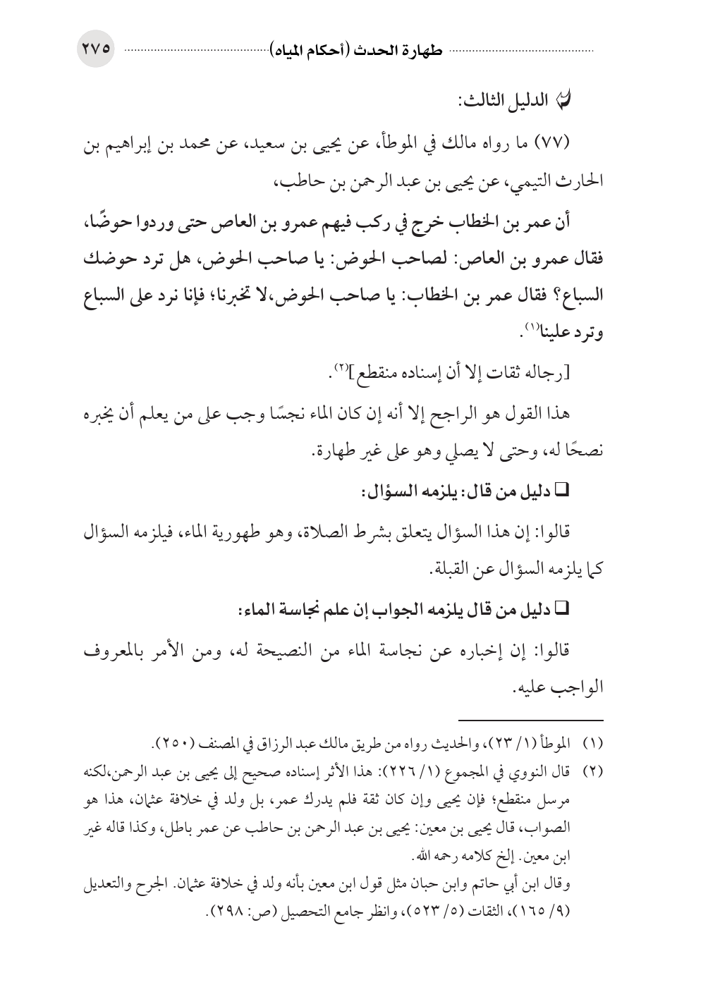 (¬٢) قال النووي في المجموع (١/ ٢٢٦): هذا الأثر إسناده صحيح إلى يحيى بن عبد الرحمن، لكنه مرسل منقطع؛ فإن يحيى وإن كان ثقة فلم يدرك عمر، بل ولد في خلافة عثمان، هذا هو الصواب، قال يحيى بن معين: يحيى بن عبد الرحمن بن حاطب عن عمر باطل، وكذا قاله غير ابن معين. إلخ كلامه رحمه الله.
