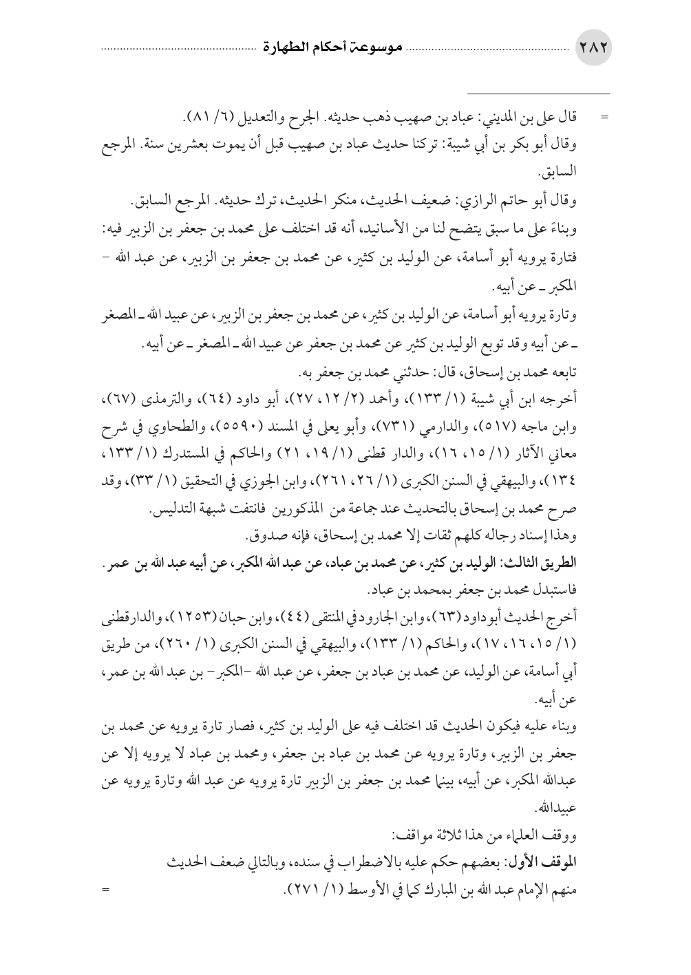 وبناء عليه فيكون الحديث قد اختلف فيه على الوليد بن كثير، فصار تارة يرويه عن محمد بن جعفر بن الزبير، وتارة يرويه عن محمد بن عباد بن جعفر، ومحمد بن عباد لا يرويه إلا عن عبدالله المكبر، عن أبيه، بينما محمد بن جعفر بن الزبير تارة يرويه عن عبد الله وتارة يرويه عن عبيدالله.