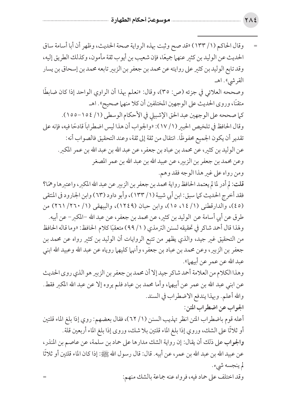 والجواب على ذلك أن يقال: إن رواية الشك مدارها على حماد بن سلمة، عن عاصم بن المنذر، عن عبيد الله بن عبد الله بن عمر، عن أبيه. قال: قال رسول الله صلى الله عليه وسلم: إذا كان الماء قلتين أو ثلاثًا لم ينجسه شيء.