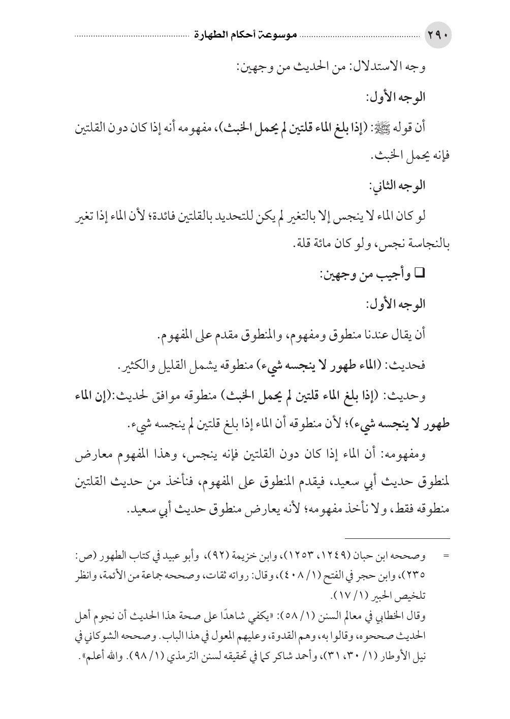 ومفهومه: أن الماء إذا كان دون القلتين فإنه ينجس، وهذا المفهوم معارض لمنطوق حديث أبي سعيد، فيقدم المنطوق على المفهوم، فنأخذ من حديث القلتين منطوقه فقط، ولا نأخذ مفهومه؛ لأنه يعارض منطوق حديث أبي سعيد.