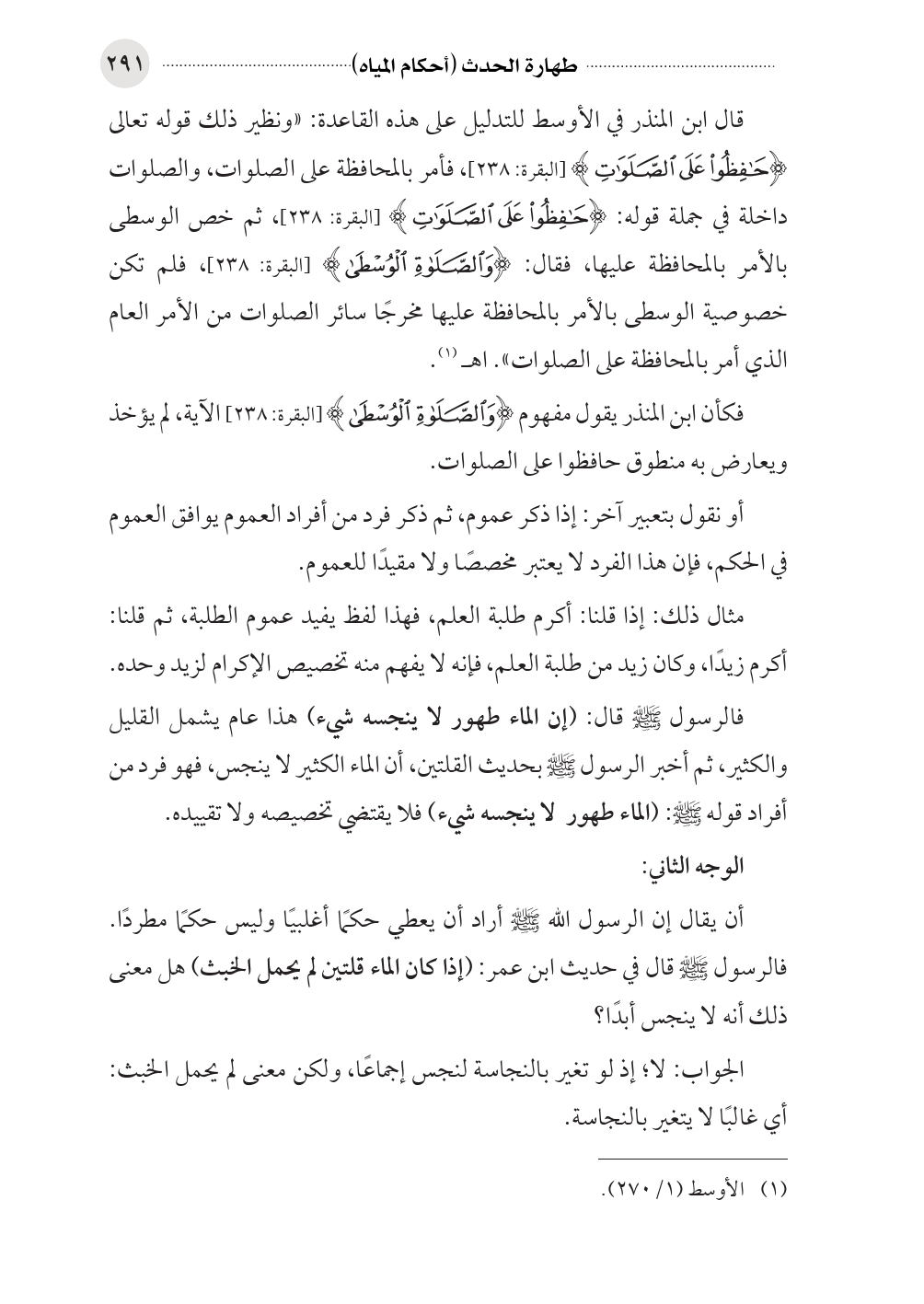 قال ابن المنذر في الأوسط للتدليل على هذه القاعدة: «ونظير ذلك قوله تعالى (حَافِظُوا عَلَى الصَّلَوَاتِ) [البقرة: ٢٣٨]، فأمر بالمحافظة على الصلوات، والصلوات داخلة في جملة قوله: (حَافِظُوا عَلَى الصَّلَوَاتِ) [البقرة: ٢٣٨]، ثم خص الوسطى بالأمر بالمحافظة عليها، فقال: (والصَّلاةِ الْوُسْطَى) [البقرة: ٢٣٨]، فلم تكن خصوصية الوسطى بالأمر بالمحافظة عليها مخرجًا سائر الصلوات من الأمر العام الذي أمر بالمحافظة على الصلوات». اهـ (¬١).