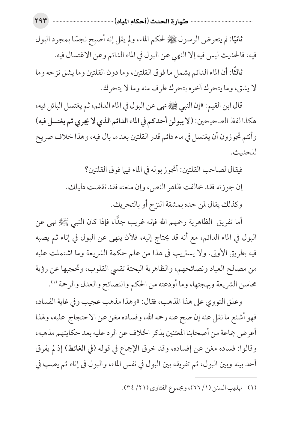 قال ابن القيم: «إن النبي صلى الله عليه وسلم نهى عن البول في الماء الدائم، ثم يغتسل البائل فيه، هكذا لفظ الصحيحين: (لا يبولن أحدكم في الماء الدائم الذي لا يجري ثم يغتسل فيه) وأنتم تجوزون أن يغتسل في ماء دائم قدر القلتين بعد ما بال فيه، وهذا خلاف صريح للحديث.