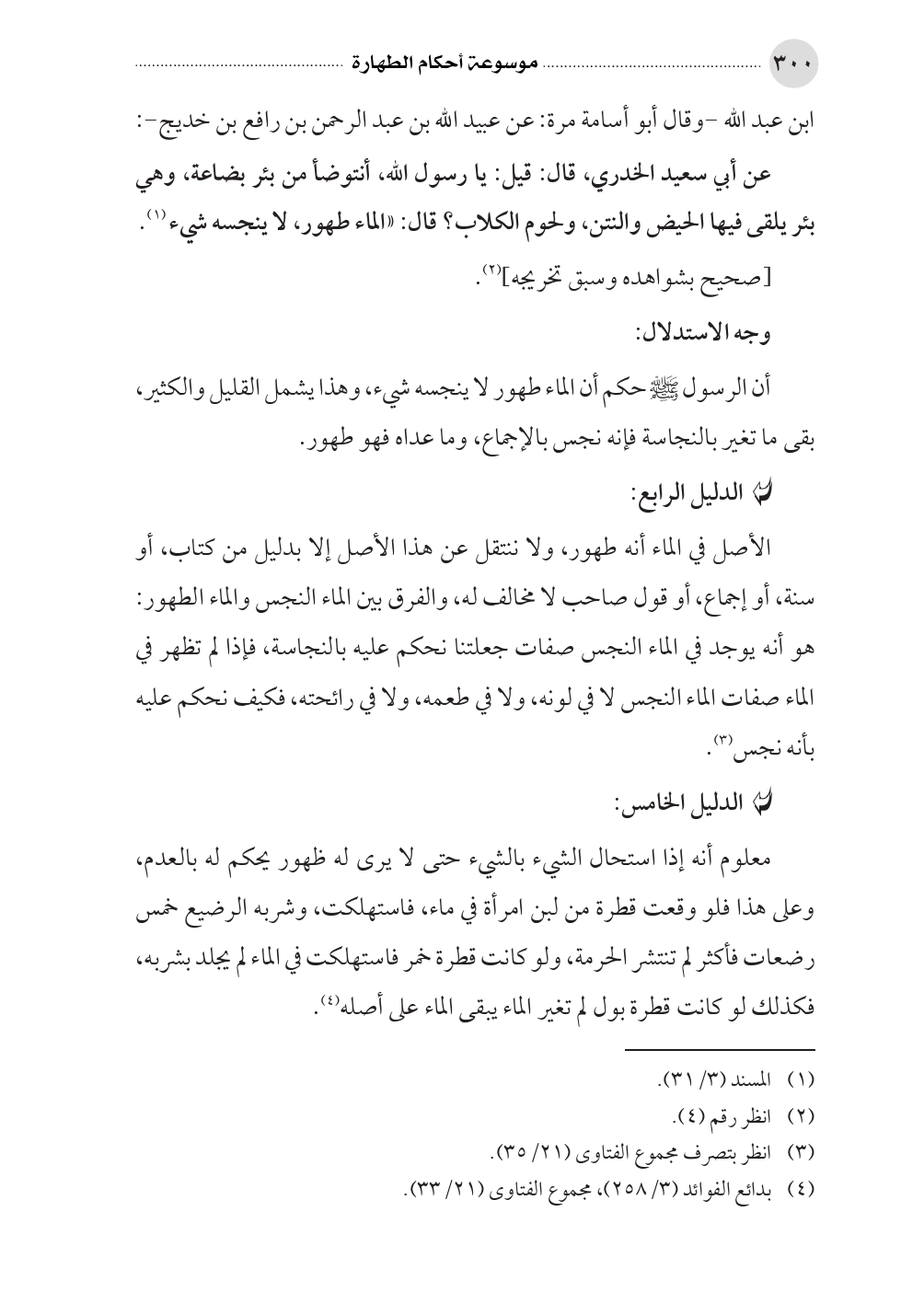 عن أبي سعيد الخدري، قال: قيل: يا رسول الله، أنتوضأ من بئر بضاعة، وهي بئر يلقى فيها الحيض والنتن، ولحوم الكلاب؟ قال: «الماء طهور، لا ينجسه شيء (¬١).