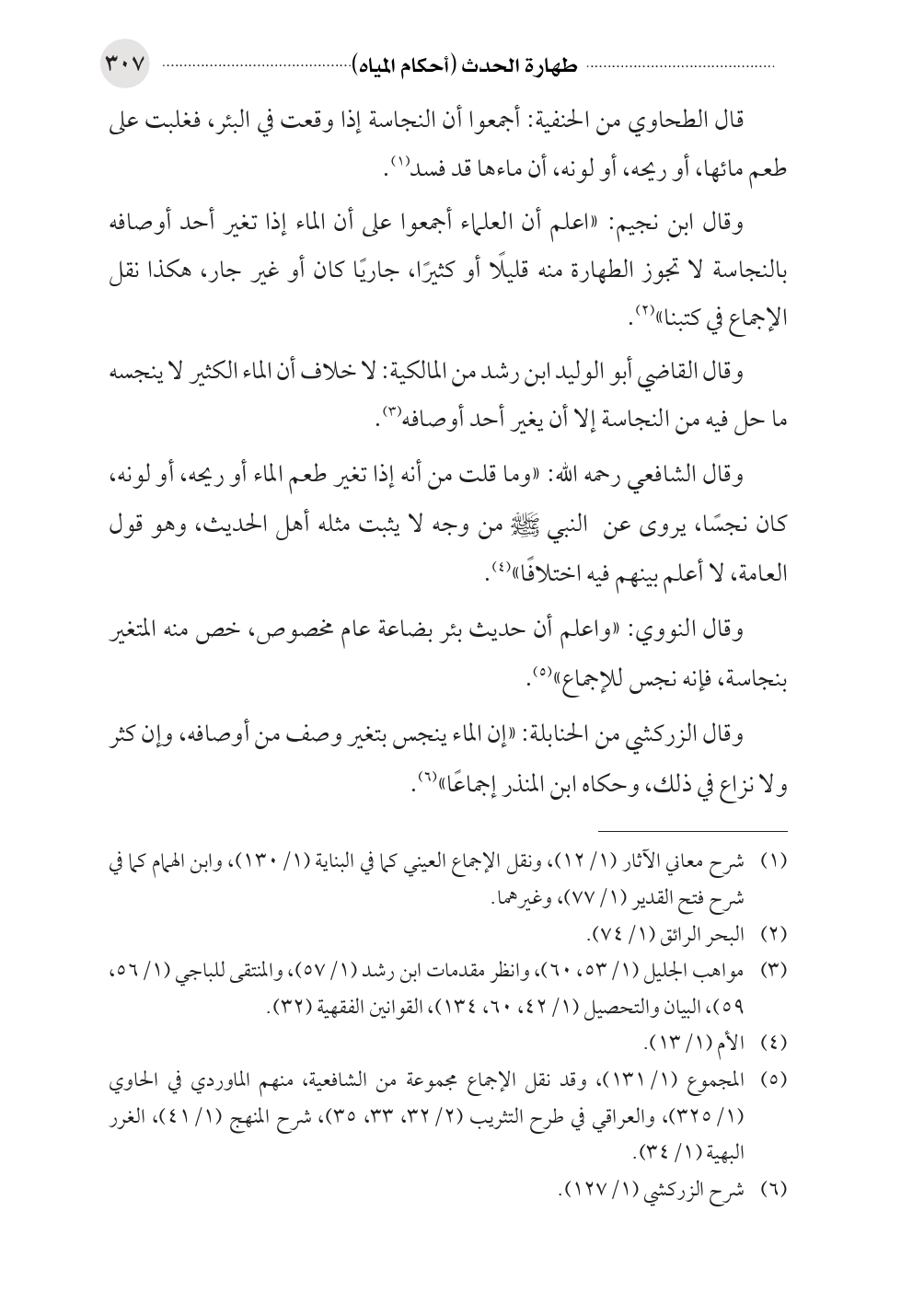وقال ابن نجيم: «اعلم أن العلماء أجمعوا على أن الماء إذا تغير أحد أوصافه بالنجاسة لا تجوز الطهارة منه قليلًا أو كثيرًا، جاريًا كان أو غير جار، هكذا نقل الإجماع في كتبنا» (¬٢).