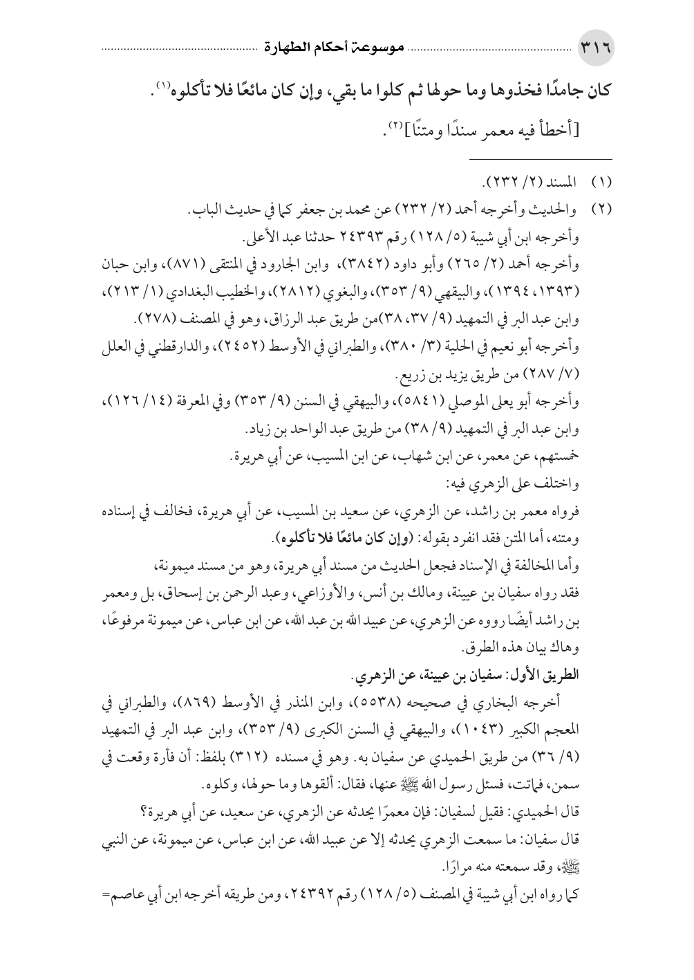 أخرجه البخاري في صحيحه (٥٥٣٨)، وابن المنذر في الأوسط (٨٦٩)، والطبراني في المعجم الكبير (١٠٤٣)، والبيهقي في السنن الكبرى (٩/ ٣٥٣)، وابن عبد البر في التمهيد (٩/ ٣٦) من طريق الحميدي عن سفيان به. وهو في مسنده (٣١٢) بلفظ: أن فأرة وقعت في سمن، فماتت، فسئل رسول الله صلى الله عليه وسلم عنها، فقال: ألقوها وما حولها، وكلوه.