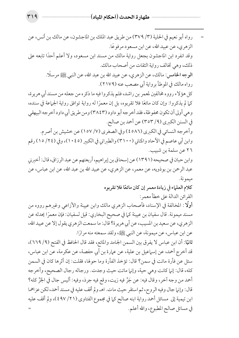 ثانيًا: أن ابن عباس لا يفرق بين السمن الجامد والمائع، فقد قال الحافظ في الفتح (٩/ ٦٦٩)، قد أخرج أحمد، عن إسماعيل بن علية، عن عمارة بن أبي حفصة، عن عكرمة، عن ابن عباس، سئل عن فأرة ماتت في سمن؟ قال: تؤخذ الفأرة وما حولها، فقلت: إن أثرها كان في السمن كله، قال: إنما كانت وهي حية، وإنما ماتت حيث وجدت. ورجاله رجال الصحيح، وأخرجه أحمد من وجه آخر، وقال فيه: عن جَرِّ فيه زيت، وقع فيه جرذ، وفيه: أليس جال في الجَرِّ كله؟ قال: وإنما جال وفيه الروح، ثم استقر حيث مات. اهـ ولم أقف عليه في مسند أحمد، لكن عزاهما ابن تيمية إلى مسائل أحمد رواية ابنه صالح كما في مجموع الفتاوى (٢١/ ٤٩٧)، ولم أقف عليه في مسائل صالح المطبوع، والله أعلم. =