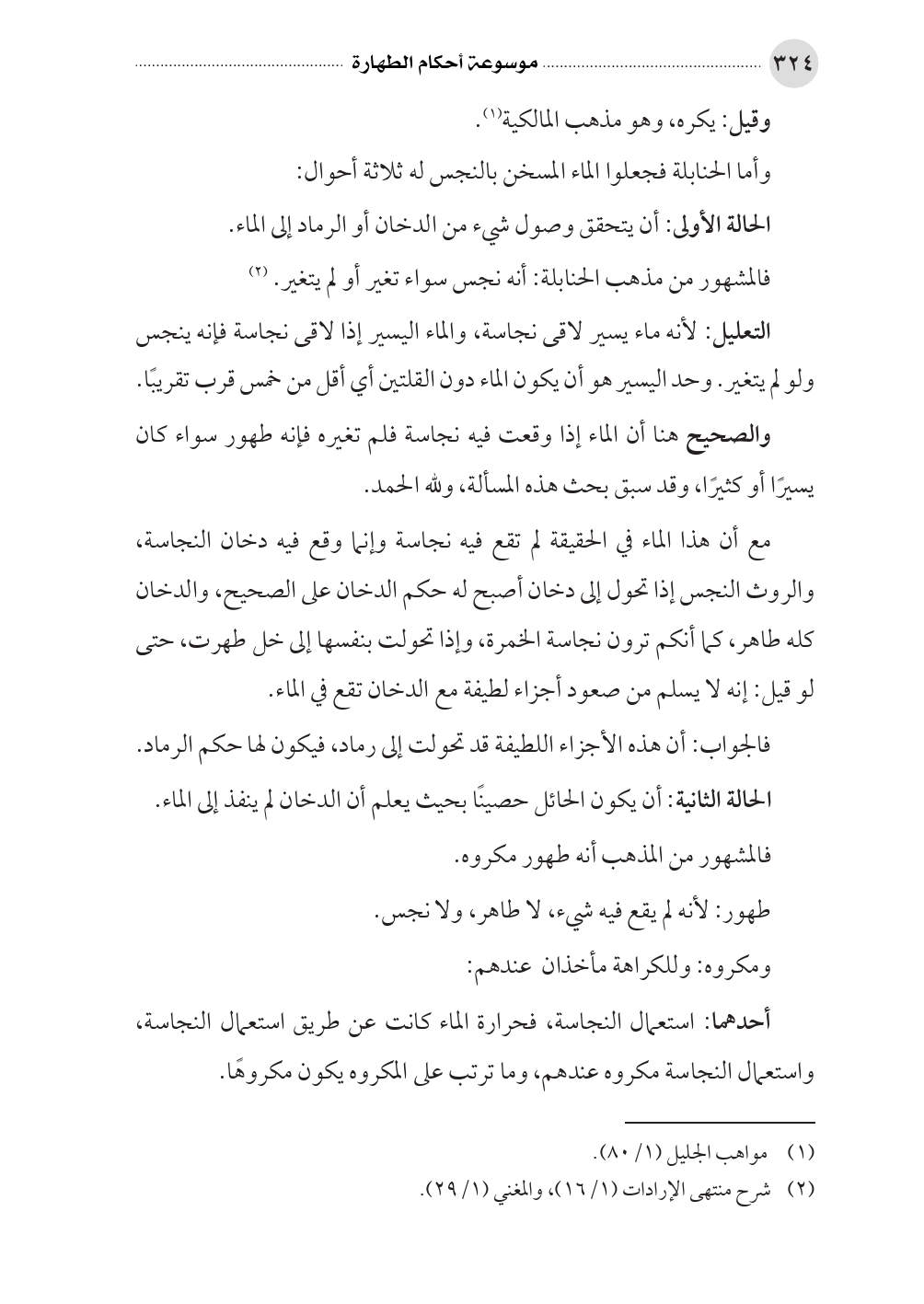 مع أن هذا الماء في الحقيقة لم تقع فيه نجاسة وإنما وقع فيه دخان النجاسة، والروث النجس إذا تحول إلى دخان أصبح له حكم الدخان على الصحيح، والدخان كله طاهر، كما أنكم ترون نجاسة الخمرة، وإذا تحولت بنفسها إلى خل طهرت، حتى لو قيل: إنه لا يسلم من صعود أجزاء لطيفة مع الدخان تقع في الماء.