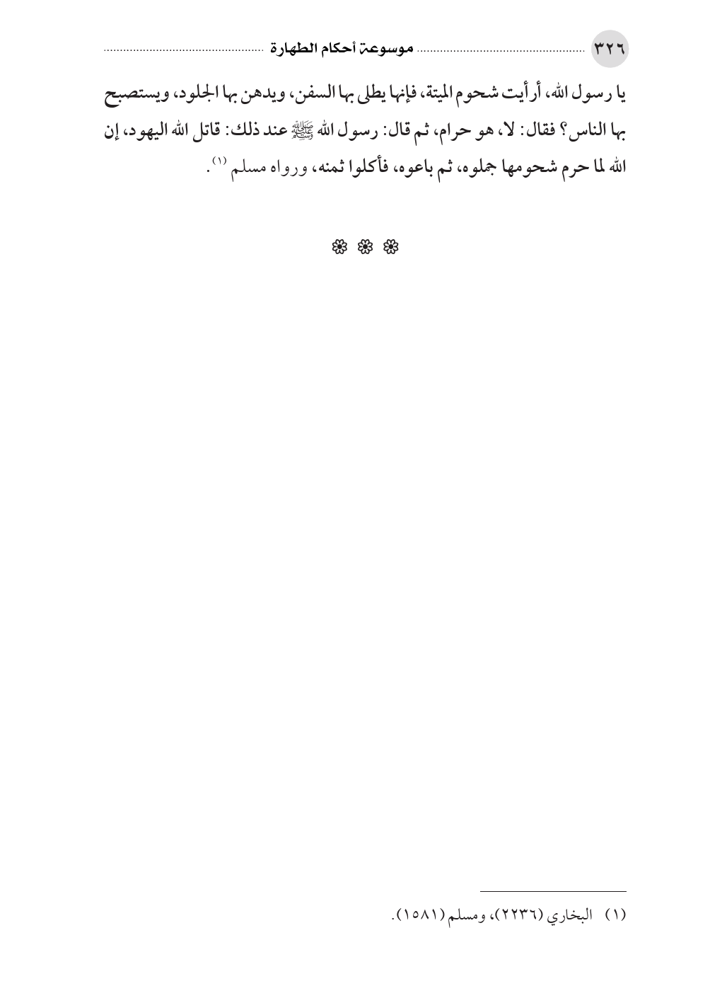 يا رسول الله، أرأيت شحوم الميتة، فإنها يطلى بها السفن، ويدهن بها الجلود، ويستصبح بها الناس؟ فقال: لا، هو حرام، ثم قال: رسول الله صلى الله عليه وسلم عند ذلك: قاتل الله اليهود، إن الله لما حرم شحومها جملوه، ثم باعوه، فأكلوا ثمنه، ورواه مسلم (¬١).