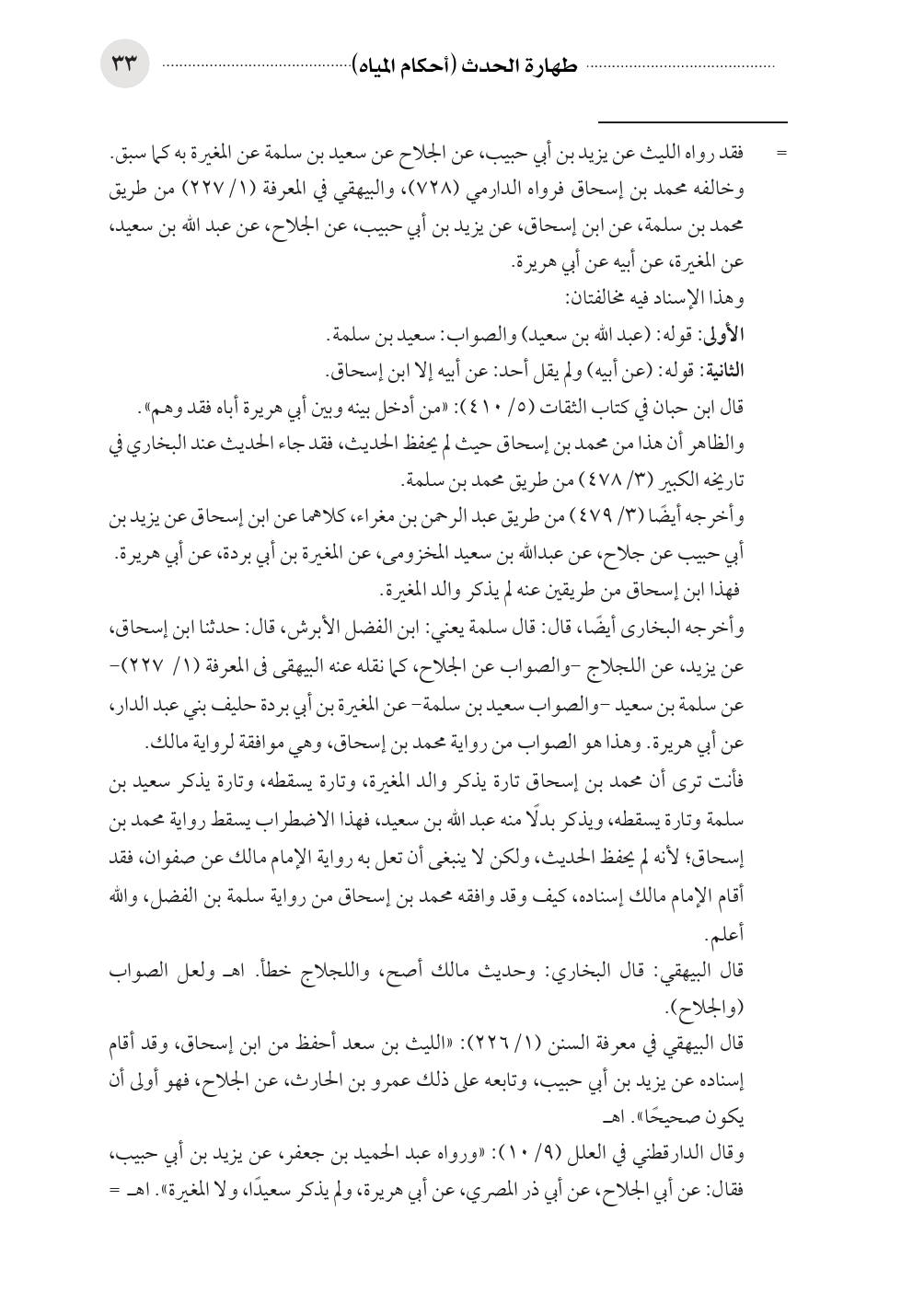 وأخرجه البخارى أيضًا، قال: قال سلمة يعني: ابن الفضل الأبرش، قال: حدثنا ابن إسحاق، عن يزيد، عن اللجلاج -والصواب عن الجلاح، كما نقله عنه البيهقى فى المعرفة (١/ ٢٢٧) - عن سلمة بن سعيد -والصواب سعيد بن سلمة- عن المغيرة بن أبي بردة حليف بني عبد الدار، عن أبي هريرة. وهذا هو الصواب من رواية محمد بن إسحاق، وهي موافقة لرواية مالك.
