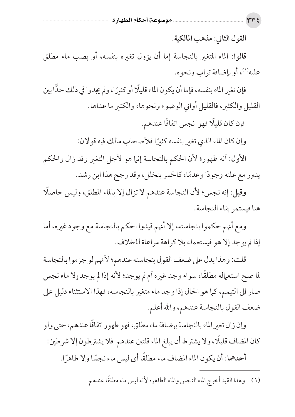 (¬١) وهذا القيد أخرج الماء النجس والماء الطاهر؛ لأنه ليس ماء مطلقًا عندهم.