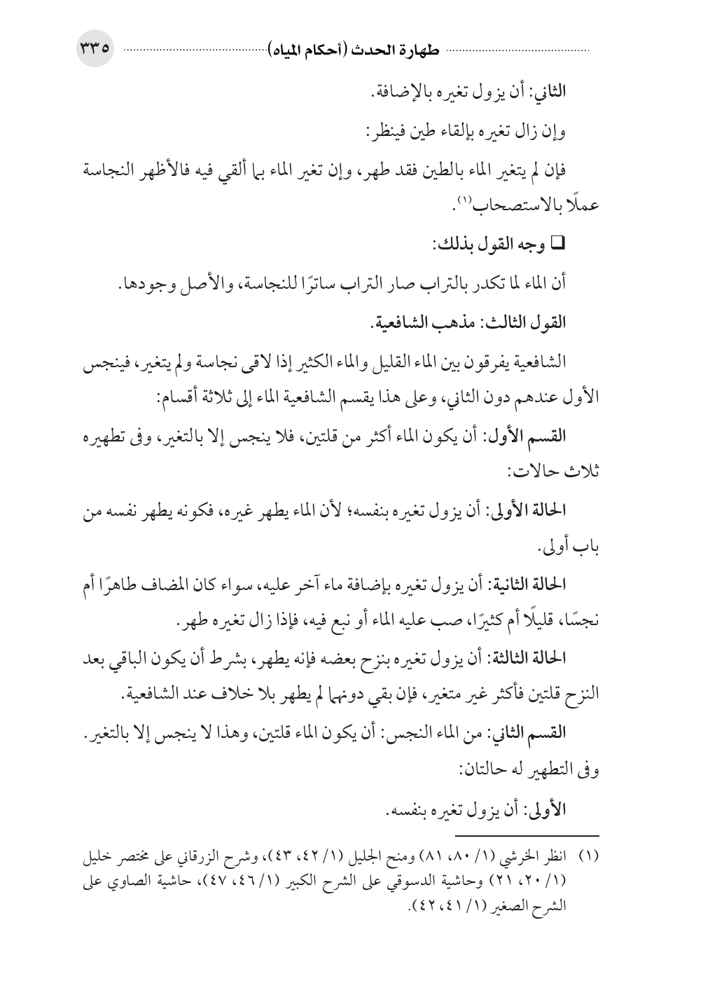 (¬١) انظر الخرشي (١/ ٨٠، ٨١) ومنح الجليل (١/ ٤٢، ٤٣)، وشرح الزرقاني على مختصر خليل (١/ ٢٠، ٢١) وحاشية الدسوقي على الشرح الكبير (١/ ٤٦، ٤٧)، حاشية الصاوي على الشرح الصغير (١/ ٤١، ٤٢).