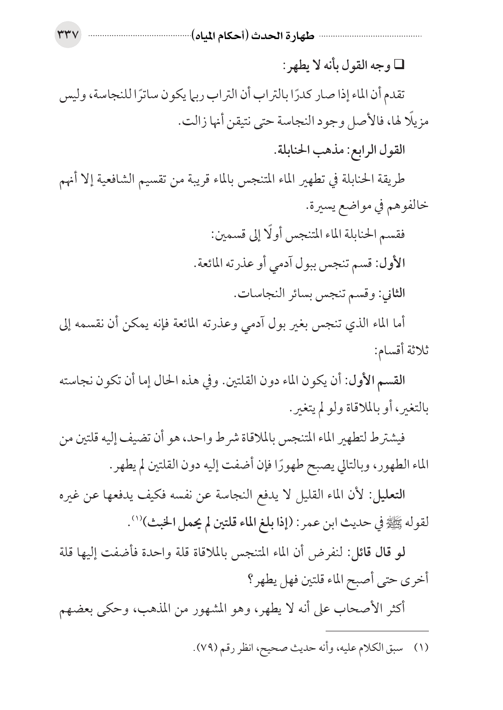 القسم الأول: أن يكون الماء دون القلتين. وفي هذه الحال إما أن تكون نجاسته بالتغير، أو بالملاقاة ولو لم يتغير.