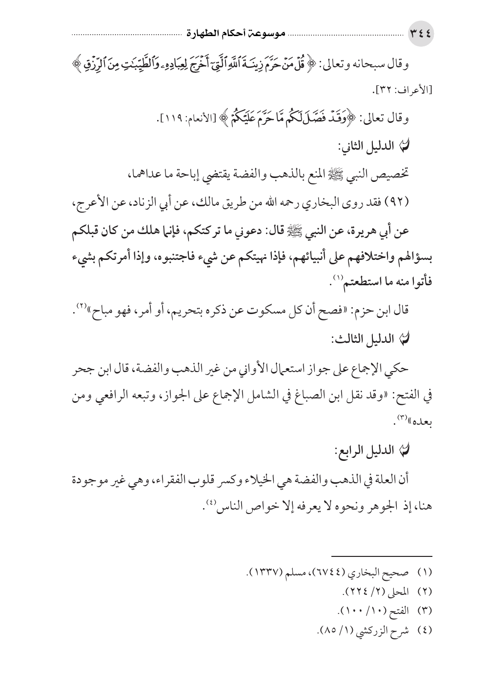 أن العلة في الذهب والفضة هي الخيلاء وكسر قلوب الفقراء، وهي غير موجودة هنا، إذ الجوهر ونحوه لا يعرفه إلا خواص الناس (¬٤).