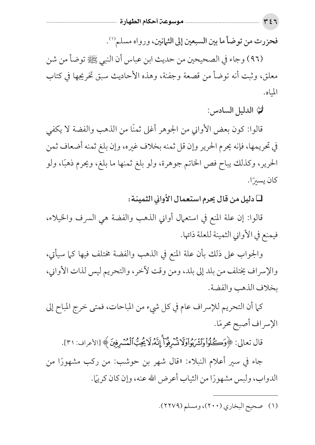 (٩٦) وجاء في الصحيحين من حديث ابن عباس أن النبي صلى الله عليه وسلم توضأ من شن معلق، وثبت أنه توضأ من قصعة وجفنة، وهذه الأحاديث سبق تخريجها في كتاب المياه.
