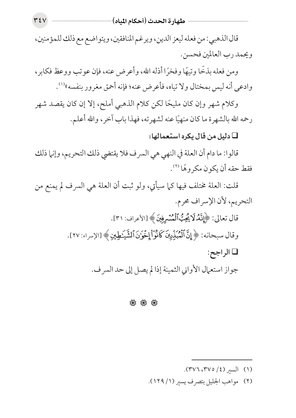قالوا: ما دام أن العلة في النهي هي السرف فلا يقتضي ذلك التحريم، وإنما ذلك فقط حقه أن يكون مكروهًا (¬٢).