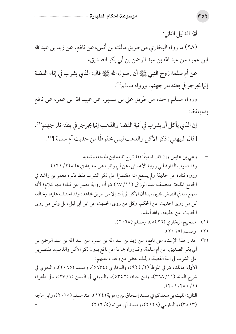 (٩٨) ما رواه البخاري من طريق مالك بن أنس، عن نافع، عن زيد بن عبدالله ابن عمر، عن عبد الله بن عبد الرحمن بن أبي بكر الصديق، عن أم سلمة زوج النبي صلى الله عليه وسلم أن رسول الله صلى الله عليه وسلم قال: الذي يشرب في إناء الفضة إنما يجرجر في بطنه نار جهنم. ورواه مسلم (¬١).