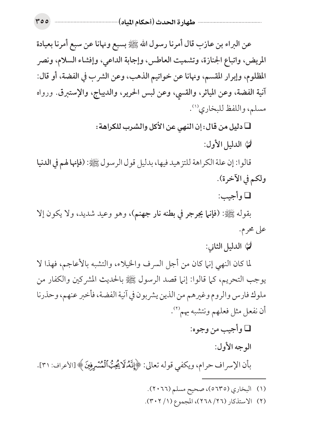 لما كان النهي إنما كان من أجل السرف والخيلاء، والتشبه بالأعاجم، فهذا لا يوجب التحريم، كما قالوا: إنما قصد الرسول صلى الله عليه وسلم بالحديث المشركين والكفار من ملوك فارس والروم وغيرهم من الذين يشربون في آنية الفضة، فأخبر عنهم، وحذرنا أن نفعل مثل فعلهم ونتشبه بهم (¬٢).