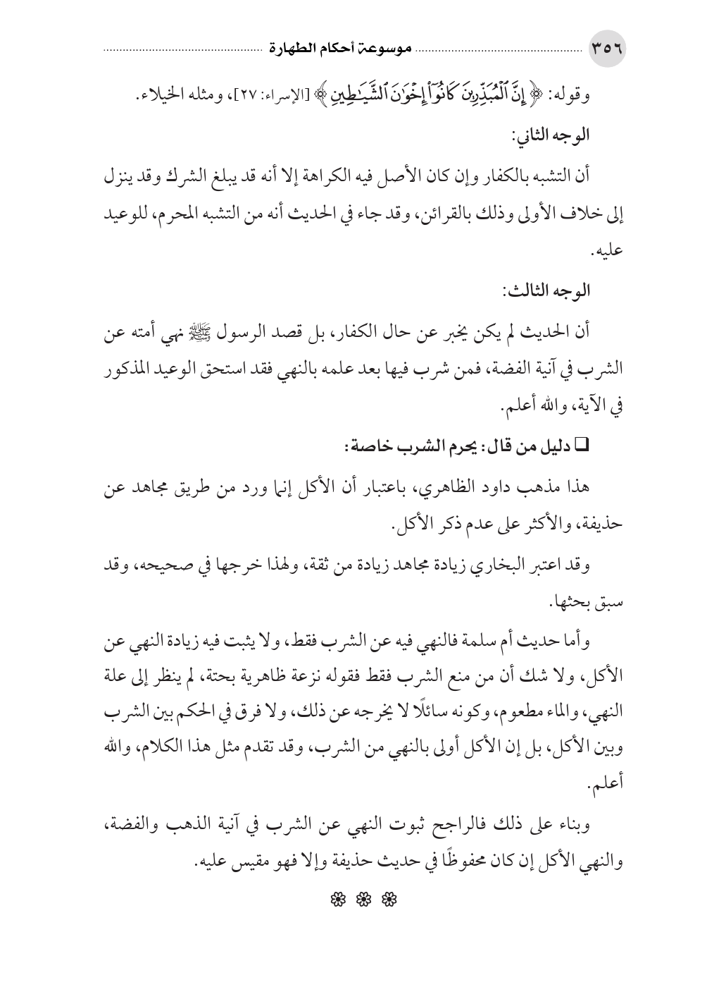 وأما حديث أم سلمة فالنهي فيه عن الشرب فقط، ولا يثبت فيه زيادة النهي عن الأكل، ولا شك أن من منع الشرب فقط فقوله نزعة ظاهرية بحتة، لم ينظر إلى علة النهي، والماء مطعوم، وكونه سائلًا لا يخرجه عن ذلك، ولا فرق في الحكم بين الشرب وبين الأكل، بل إن الأكل أولى بالنهي من الشرب، وقد تقدم مثل هذا الكلام، والله أعلم.
