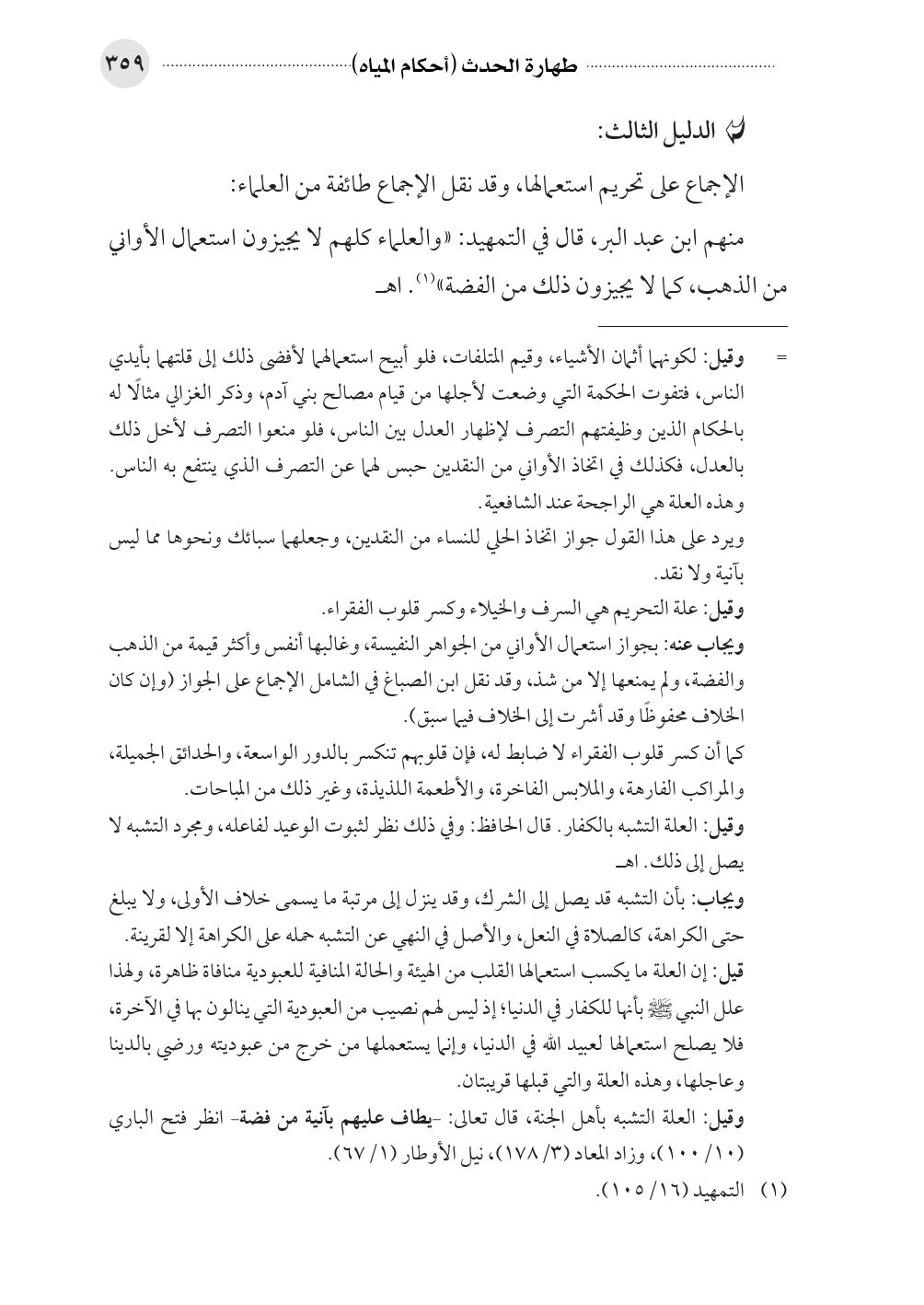 منهم ابن عبد البر، قال في التمهيد: «والعلماء كلهم لا يجيزون استعمال الأواني من الذهب، كما لا يجيزون ذلك من الفضة» (¬١). اهـ