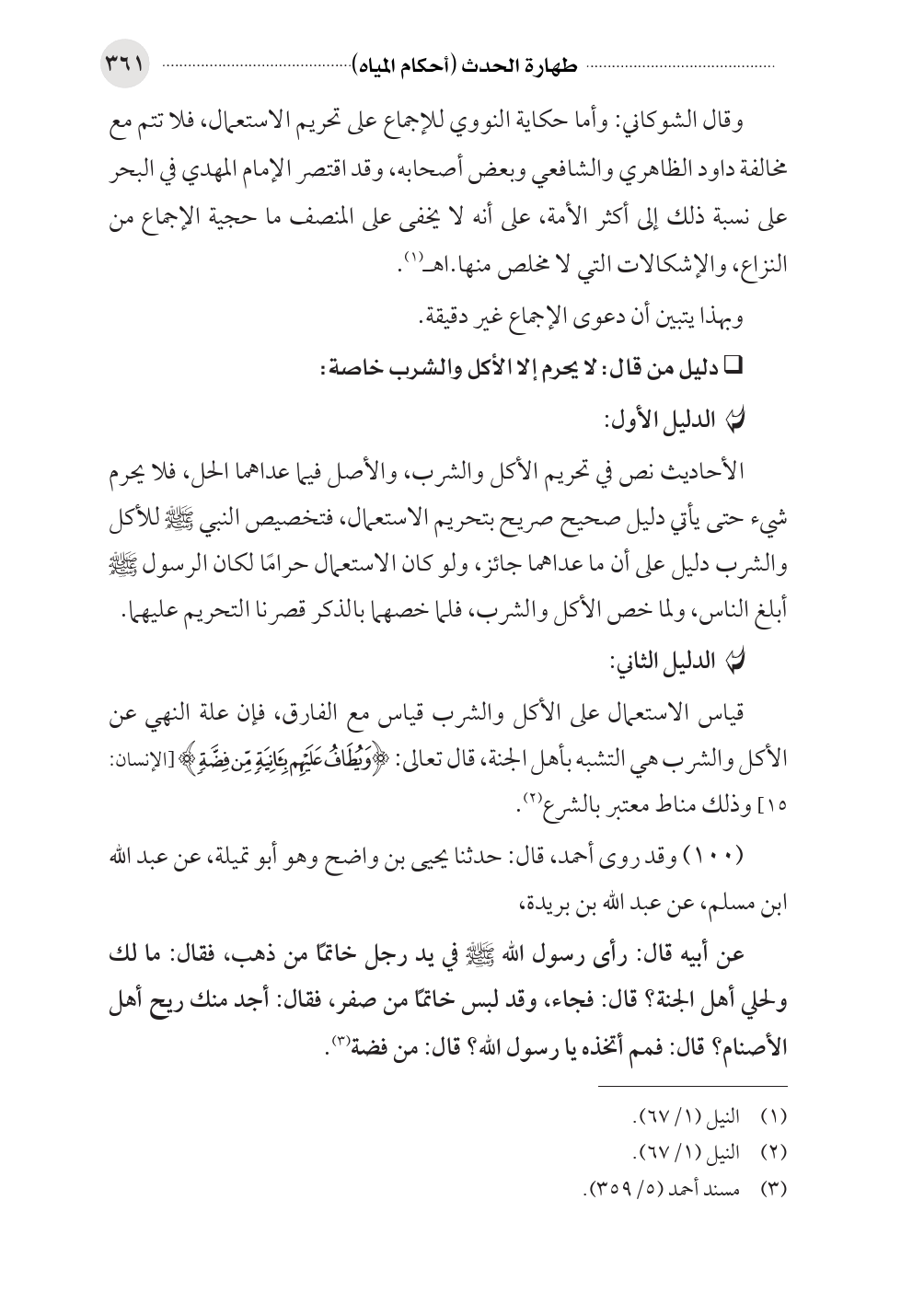 وقال الشوكاني: وأما حكاية النووي للإجماع على تحريم الاستعمال، فلا تتم مع مخالفة داود الظاهري والشافعي وبعض أصحابه، وقد اقتصر الإمام المهدي في البحر على نسبة ذلك إلى أكثر الأمة، على أنه لا يخفى على المنصف ما حجية الإجماع من النزاع، والإشكالات التي لا مخلص منها. اهـ (¬١).