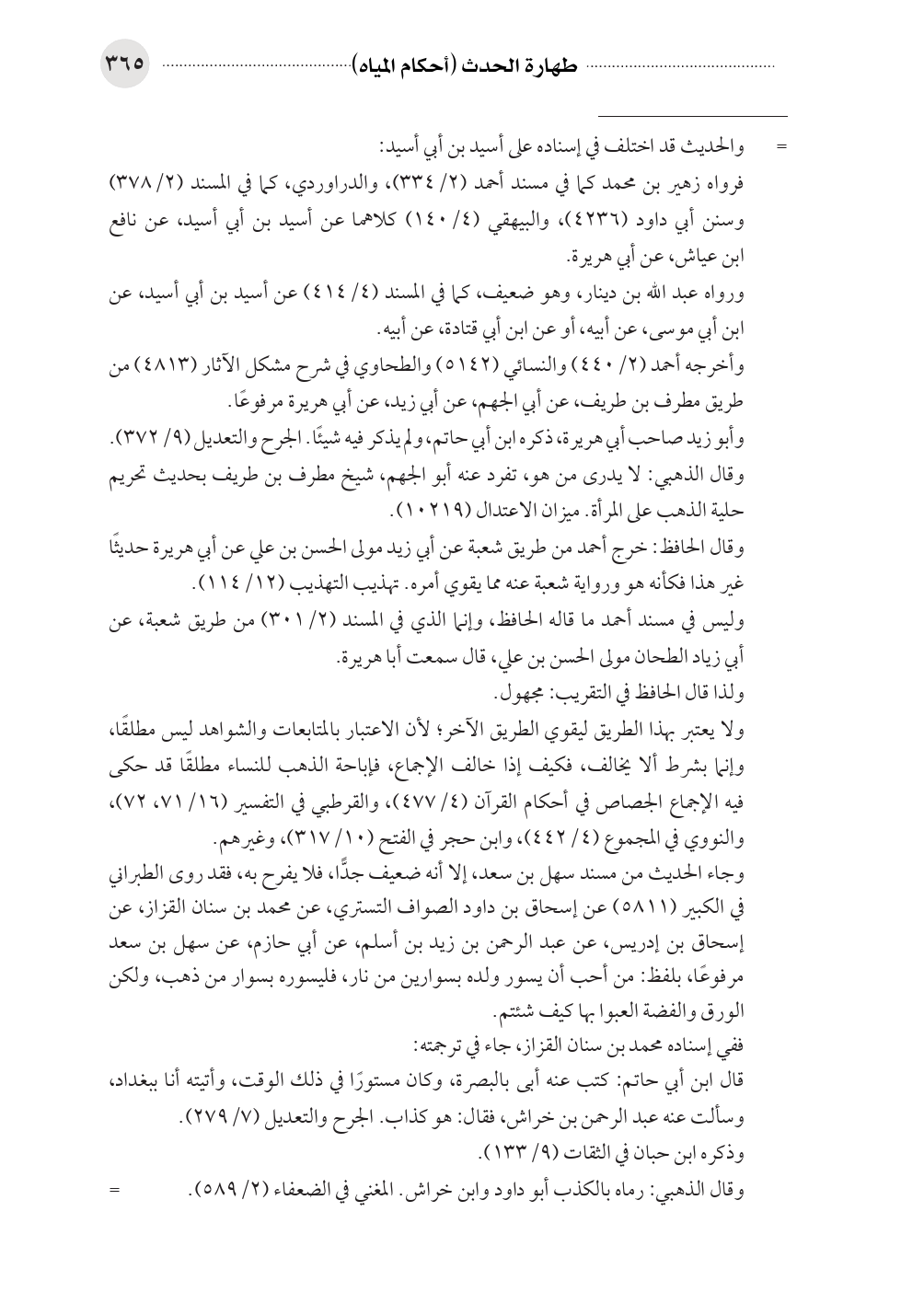 ولا يعتبر بهذا الطريق ليقوي الطريق الآخر؛ لأن الاعتبار بالمتابعات والشواهد ليس مطلقًا، وإنما بشرط ألا يخالف، فكيف إذا خالف الإجماع، فإباحة الذهب للنساء مطلقًا قد حكى فيه الإجماع الجصاص في أحكام القرآن (٤/ ٤٧٧)، والقرطبي في التفسير (١٦/ ٧١، ٧٢)، والنووي في المجموع (٤/ ٤٤٢)، وابن حجر في الفتح (١٠/ ٣١٧)، وغيرهم.
