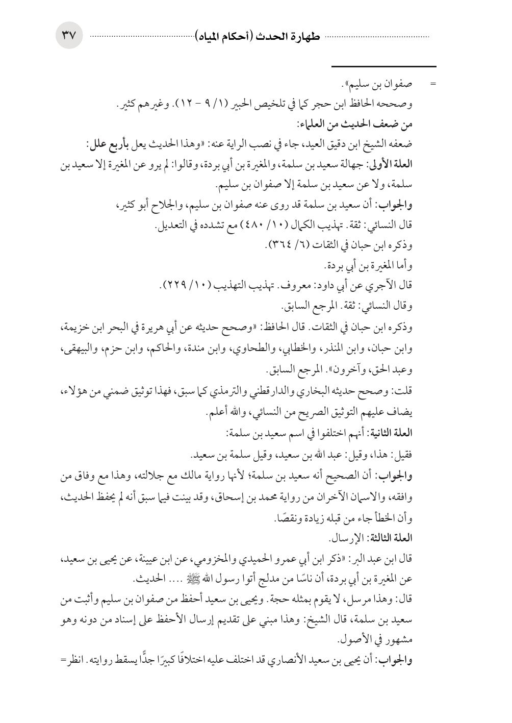 قال: وهذا مرسل، لا يقوم بمثله حجة. ويحيى بن سعيد أحفظ من صفوان بن سليم وأثبت من سعيد بن سلمة، قال الشيخ: وهذا مبني على تقديم إرسال الأحفظ على إسناد من دونه وهو مشهور في الأصول.