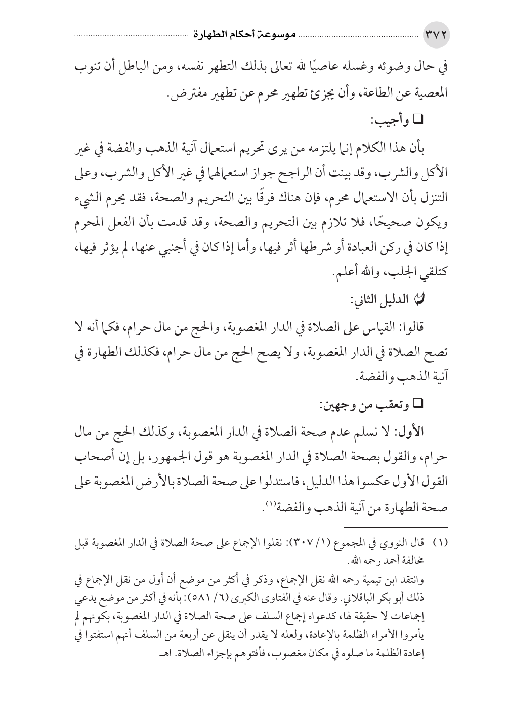 الأول: لا نسلم عدم صحة الصلاة في الدار المغصوبة، وكذلك الحج من مال حرام، والقول بصحة الصلاة في الدار المغصوبة هو قول الجمهور، بل إن أصحاب القول الأول عكسوا هذا الدليل، فاستدلوا على صحة الصلاة بالأرض المغصوبة على صحة الطهارة من آنية الذهب والفضة (¬١).