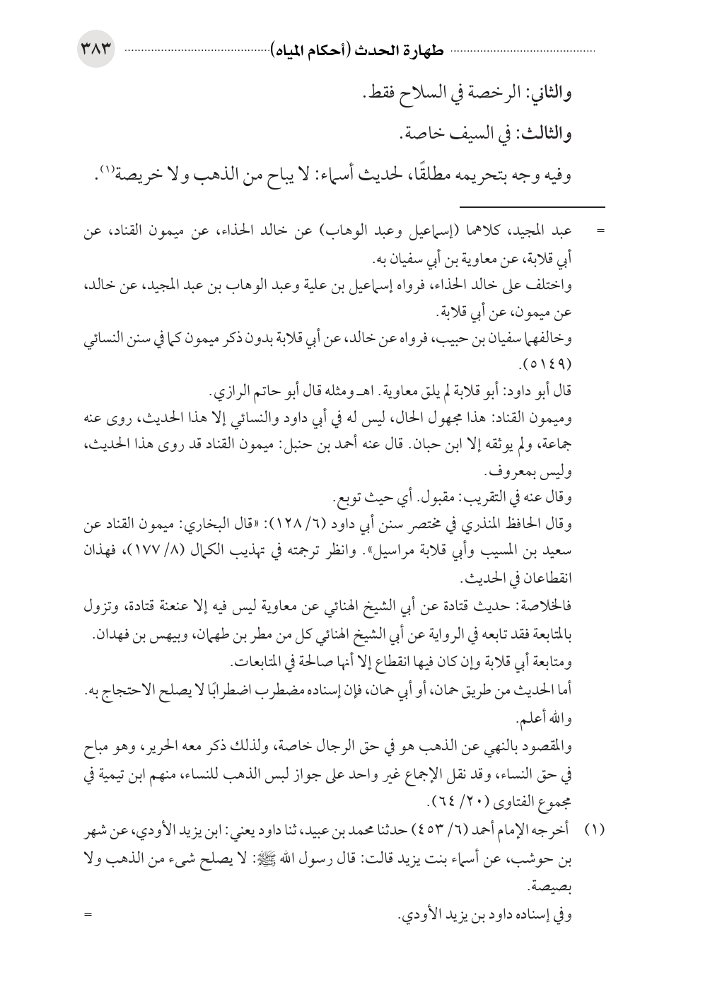 (¬١) أخرجه الإمام أحمد (٦/ ٤٥٣) حدثنا محمد بن عبيد، ثنا داود يعني: ابن يزيد الأودي، عن شهر بن حوشب، عن أسماء بنت يزيد قالت: قال رسول الله صلى الله عليه وسلم: لا يصلح شيء من الذهب ولا بصيصة.