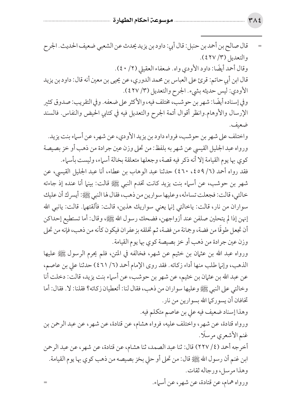فقد رواه أحمد (٦/ ٤٥٩، ٤٦٠) حدثنا عبد الوهاب بن عطاء، أنا عبد الجليل القيسي، عن شهر بن حوشب، عن أسماء بنت يزيد كانت تخدم النبي صلى الله عليه وسلم قالت: بينما أنا عنده إذ جاءته خالتي، قالت: فجعلت تساءله، وعليها سوارين من ذهب، فقال لها النبي صلى الله عليه وسلم: أيسرك أن عليك سواران من نار، قالت: ياخالتي إنما يعني سواريك هذين، قالت: فألقتهما. قالت: يانبي الله إنهن إذا لم يتحلين صلفن عند أزواجهن، فضحك رسول الله صلى الله عليه وسلم، وقال: أما تستطيع إحداكن أن تجعل طوقًا من فضة، وجمانة من فضة، ثم تخلقه بزعفران فيكون كأنه من ذهب، فإنه من تحلى وزن عين جرادة من ذهب أو خز بصيصة كوي بها يوم القيامة.