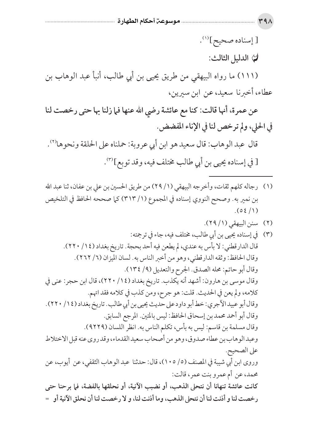 (١١١) ما رواه البيهقي من طريق يحيى بن أبي طالب، أنبأ عبد الوهاب بن عطاء، أخبرنا سعيد، عن ابن سيرين، عن عمرة، أنها قالت: كنا مع عائشة رضي الله عنها فما زلنا بها حتى رخصت لنا في الحلي، ولم ترخص لنا في الإناء المفضض.